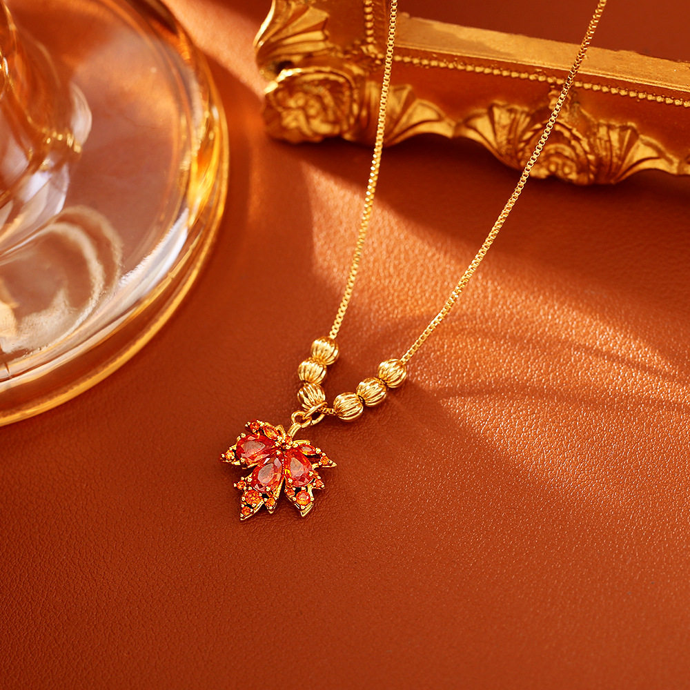 红色枫叶锆石吊坠项链锁骨链镶钻高级感叶子镀金耳钉耳扣耳环饰品