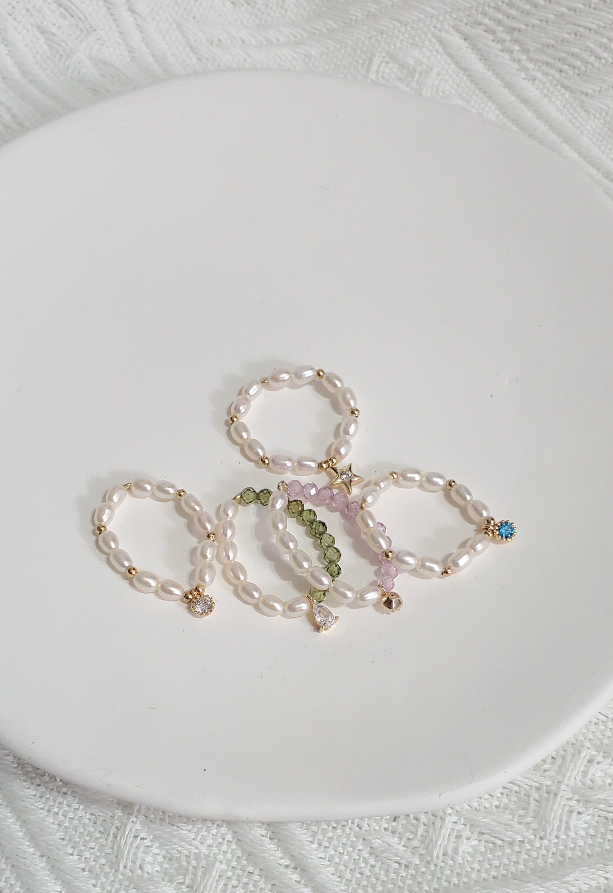 原创极光泽天然淡水珍珠小米珠戒指弹力镶嵌宝石人工锆石粉色紫色