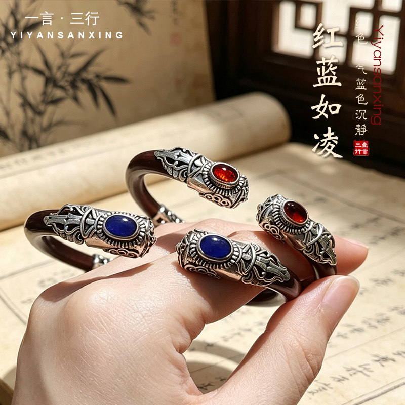 情侣款红蓝cp鸡血藤民族风天然木材手镯男女做旧工艺实心中性饰品