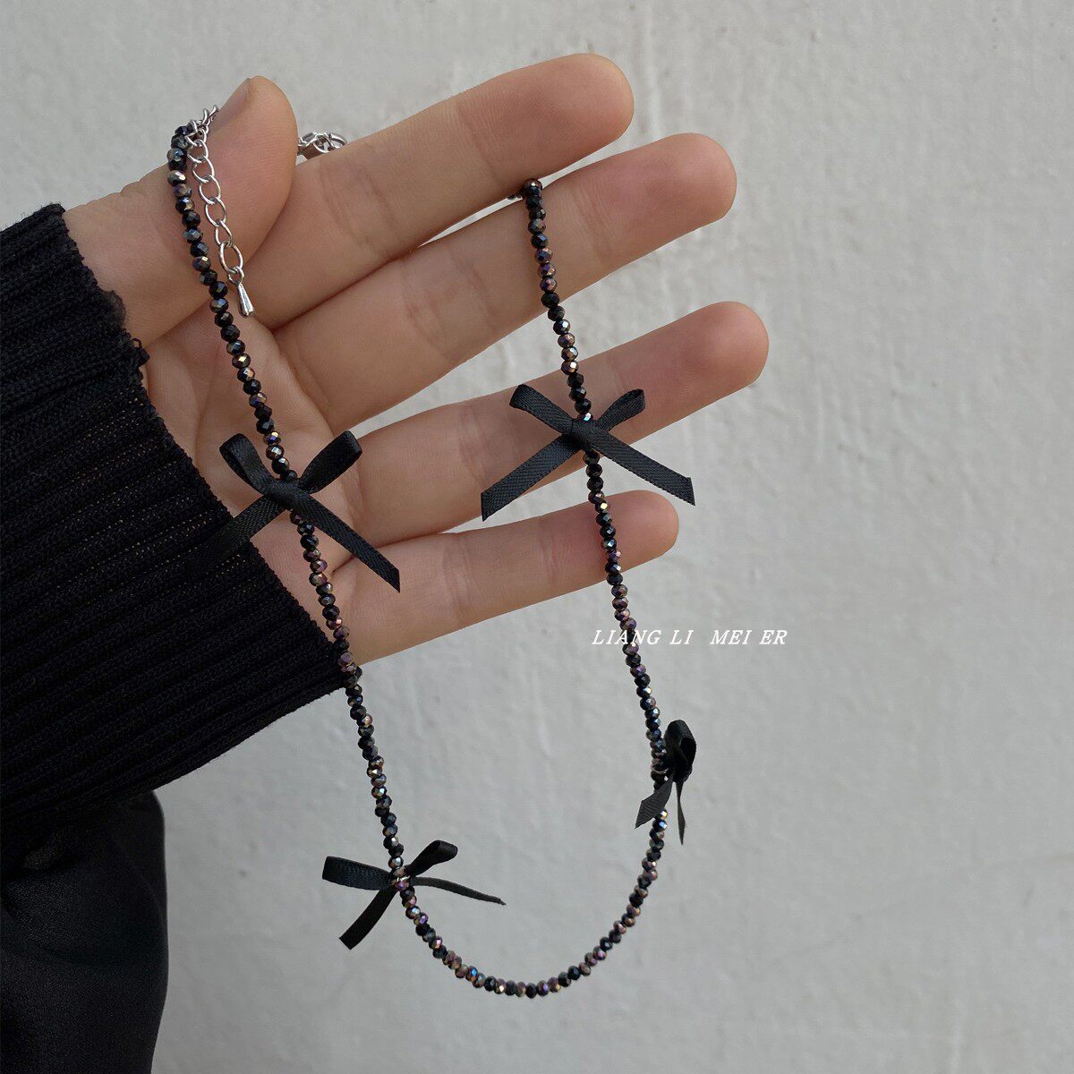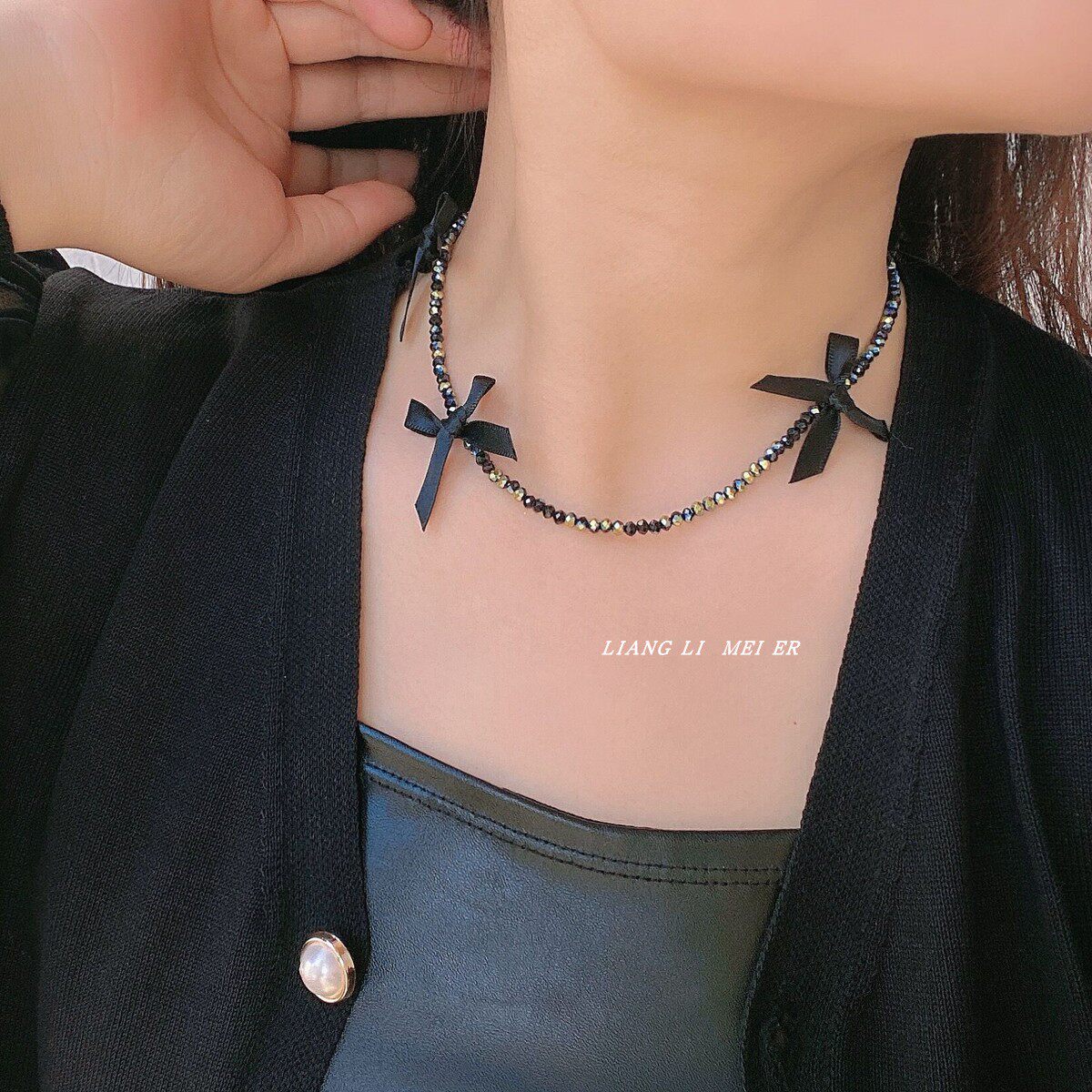 黑色水晶项链女蝴蝶结短款锁骨链纯欲辣妹蕾丝结轻奢颈带项圈配饰