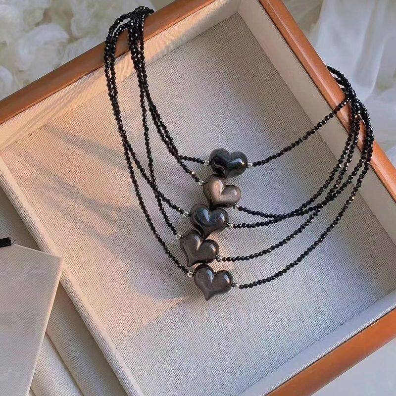 爆款黑曜石屁桃爱心黑尖晶石锁骨链时尚气质心形黑色吊坠项链