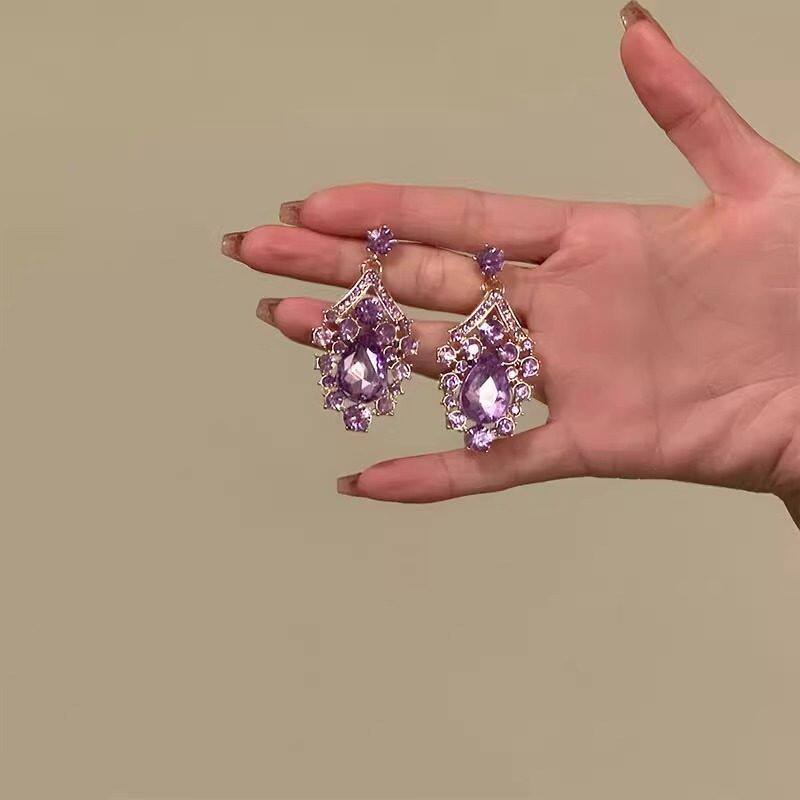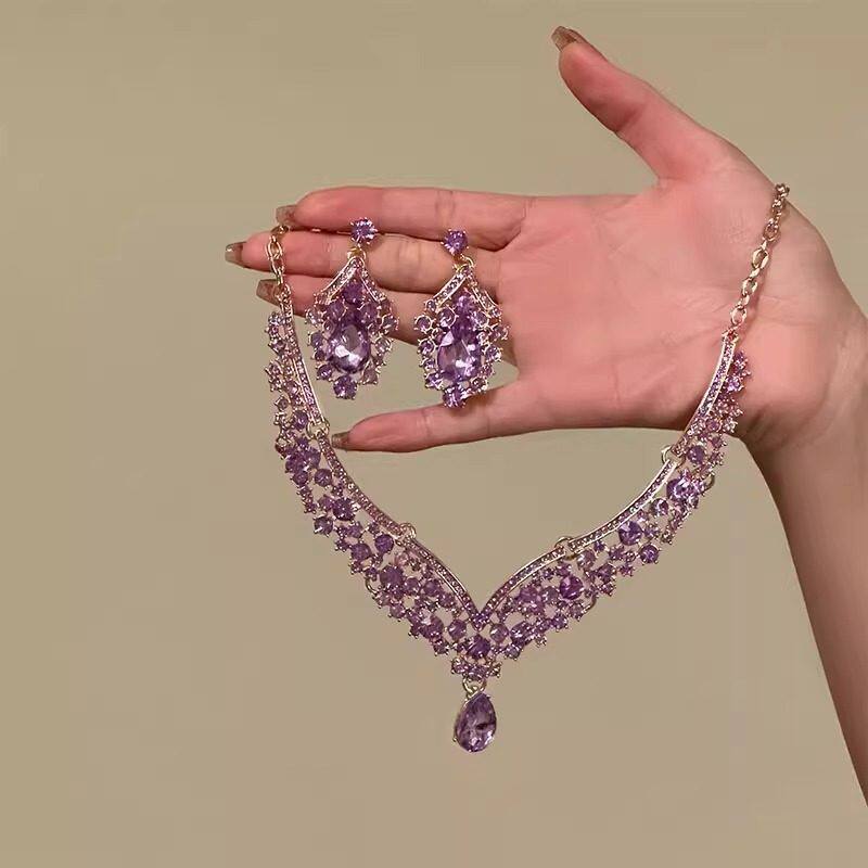 HTZS跨境紫色水滴锆石项链耳环套装女轻奢高级感晚礼服配饰锁骨链