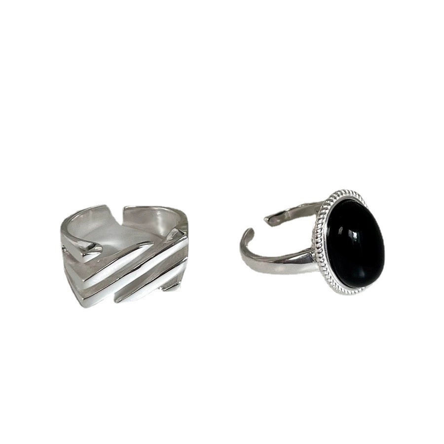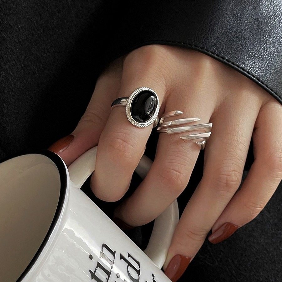 高级感黑色椭圆戒指女简约线条个性时髦S925镀银开口指环嘻哈食指