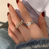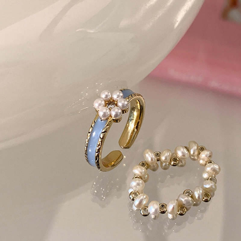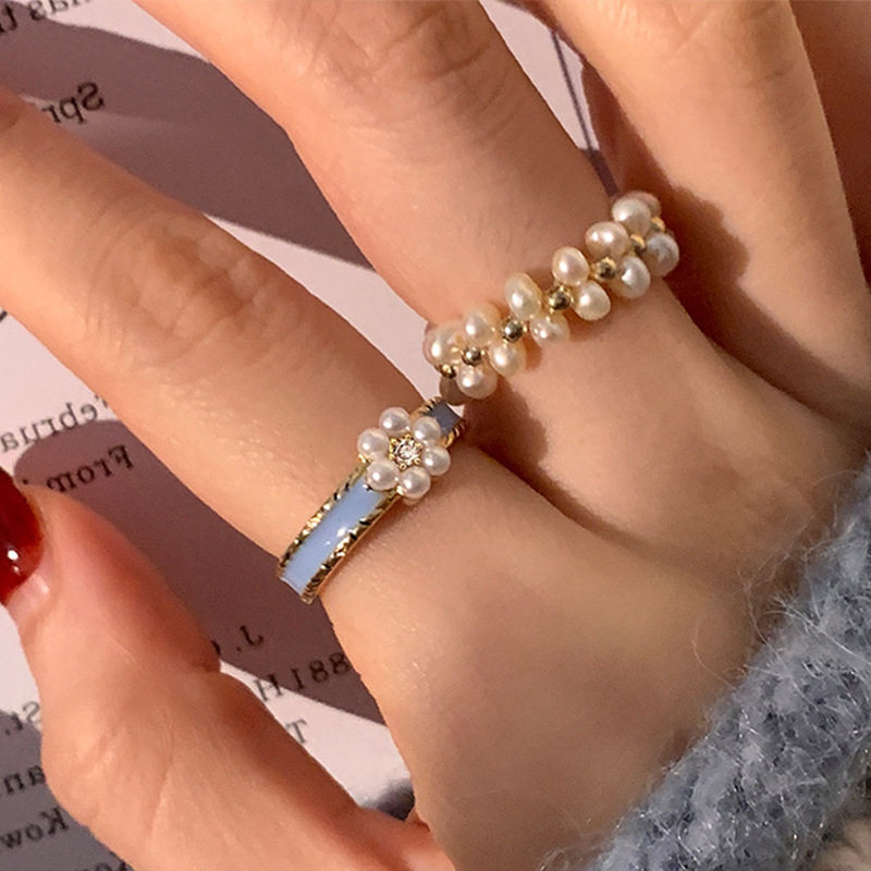 蓝色滴油珍珠花朵戒指套装女韩国复古个性简约百搭气质指环戒子