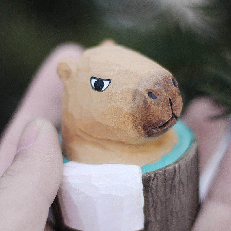 鹿妖商店 泡汤水豚卡皮巴拉情绪稳定 纯手工动物木雕实木桌面摆件