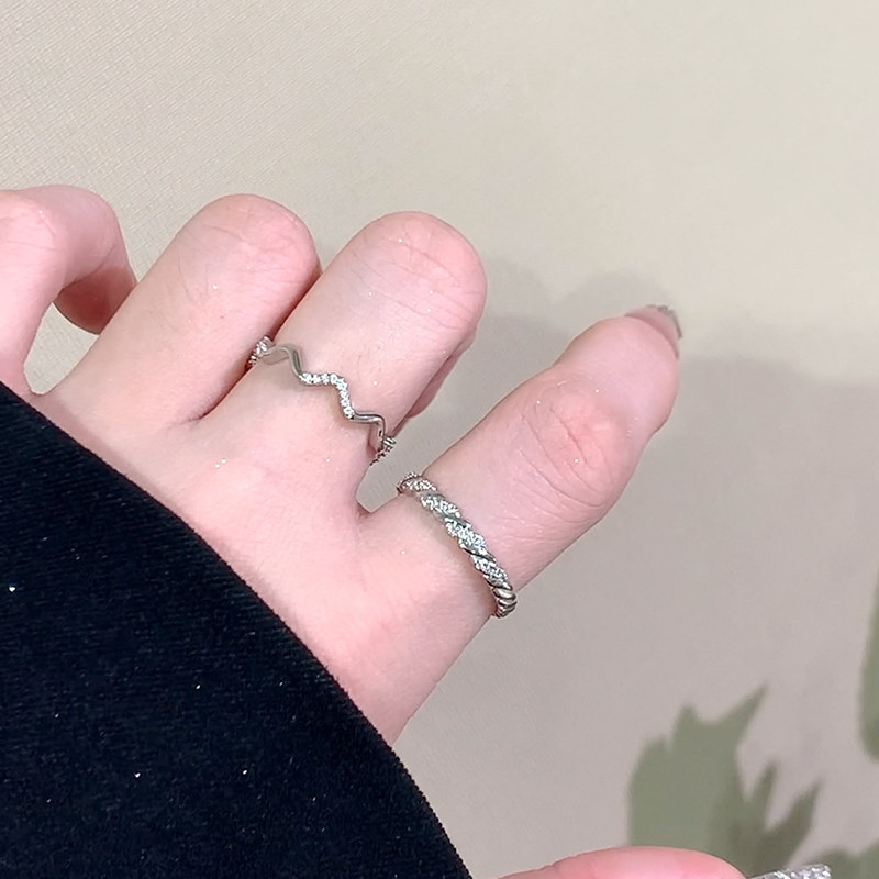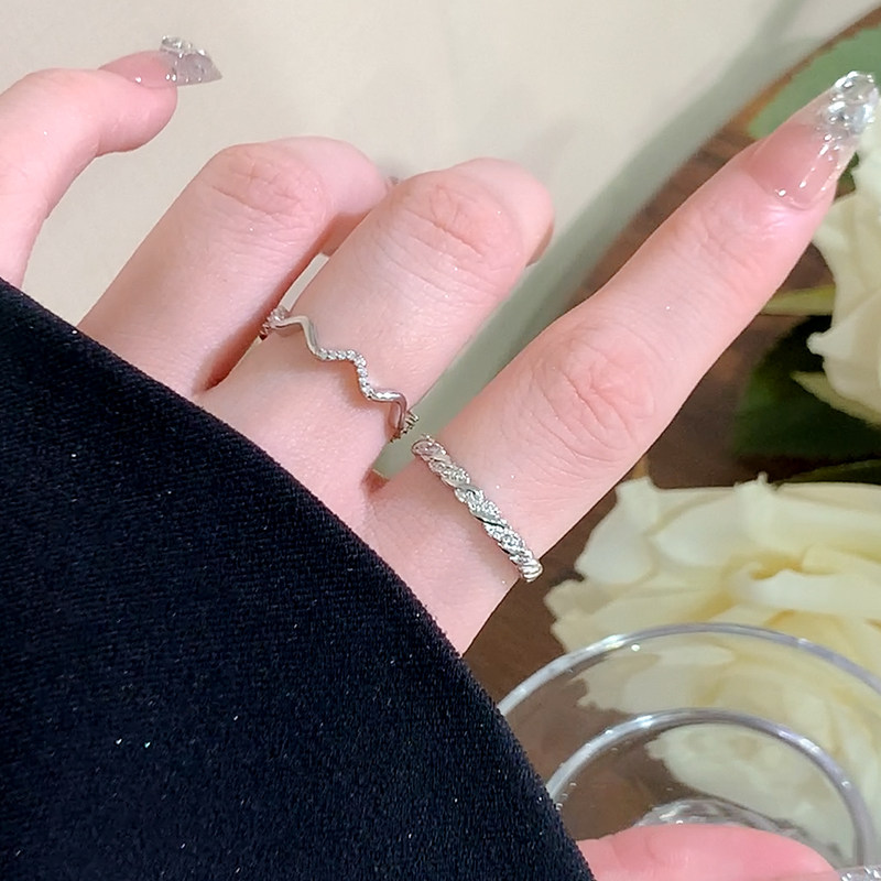 银色素圈戒指女小众设计高级感对戒镶钻食指戒指女开口尾戒指环女