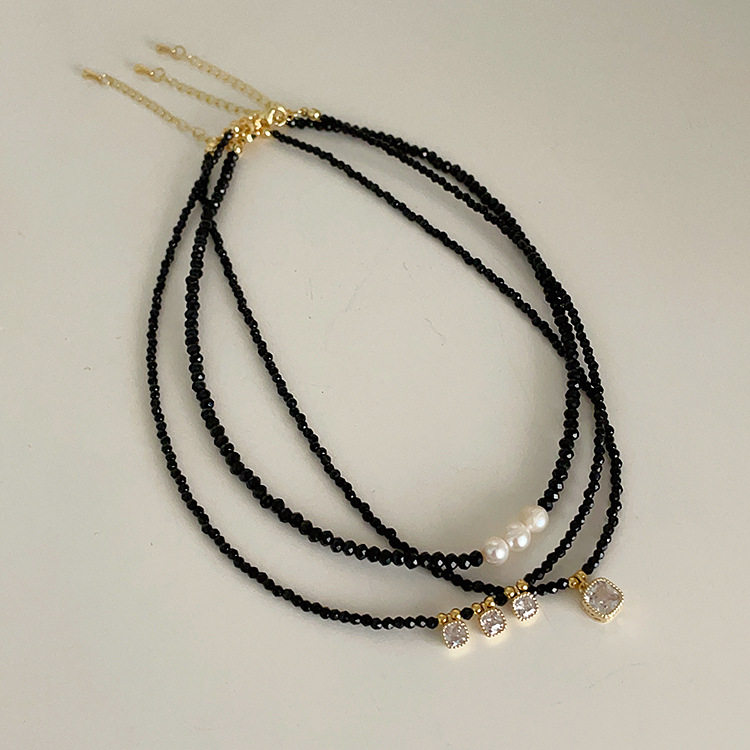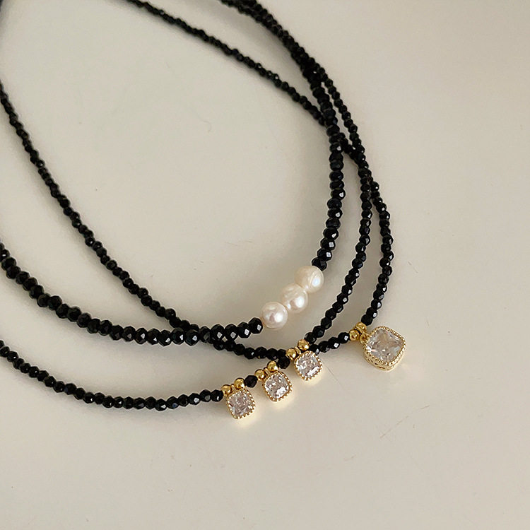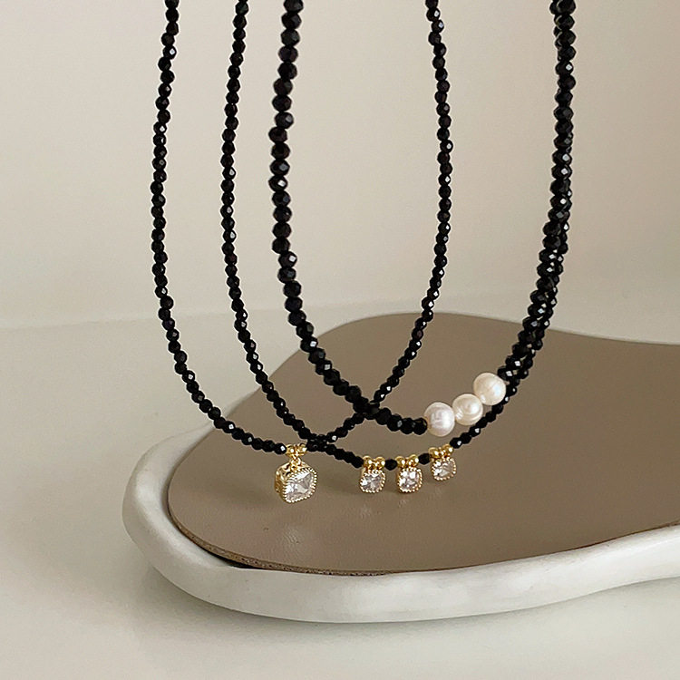 感黑色水晶锆钻珍珠吊坠项链女设计感小众复古个性颈链锁骨链