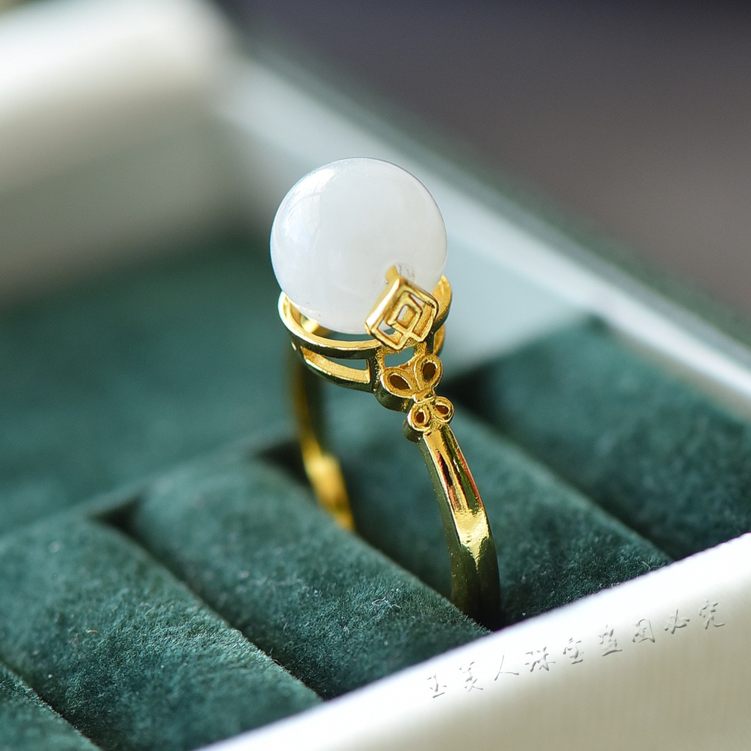 天然和田玉白玉蛋面镶嵌戒指女款个性大气玉石指环开口可调节戒子