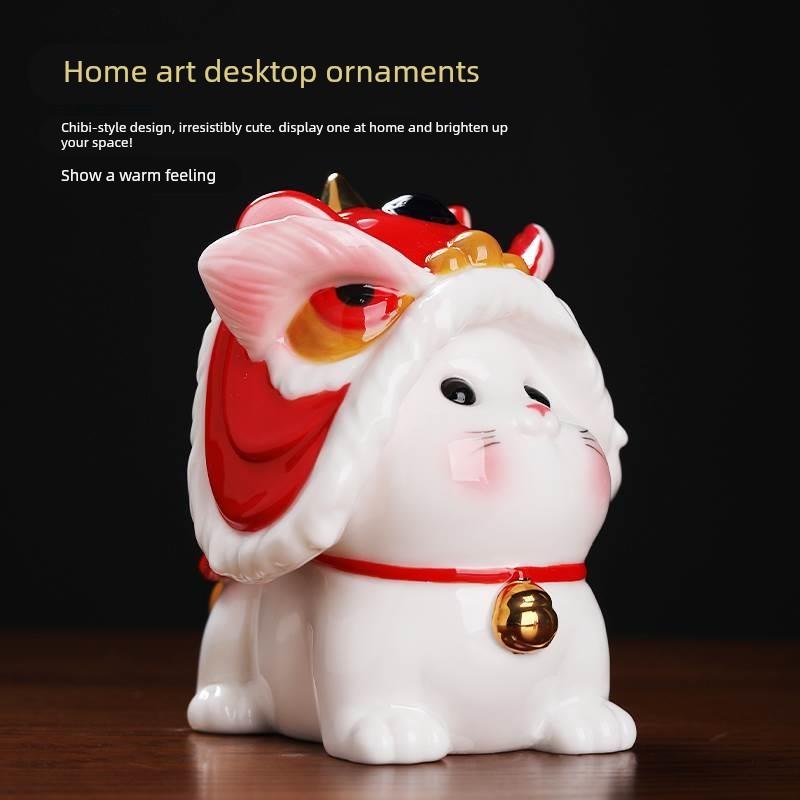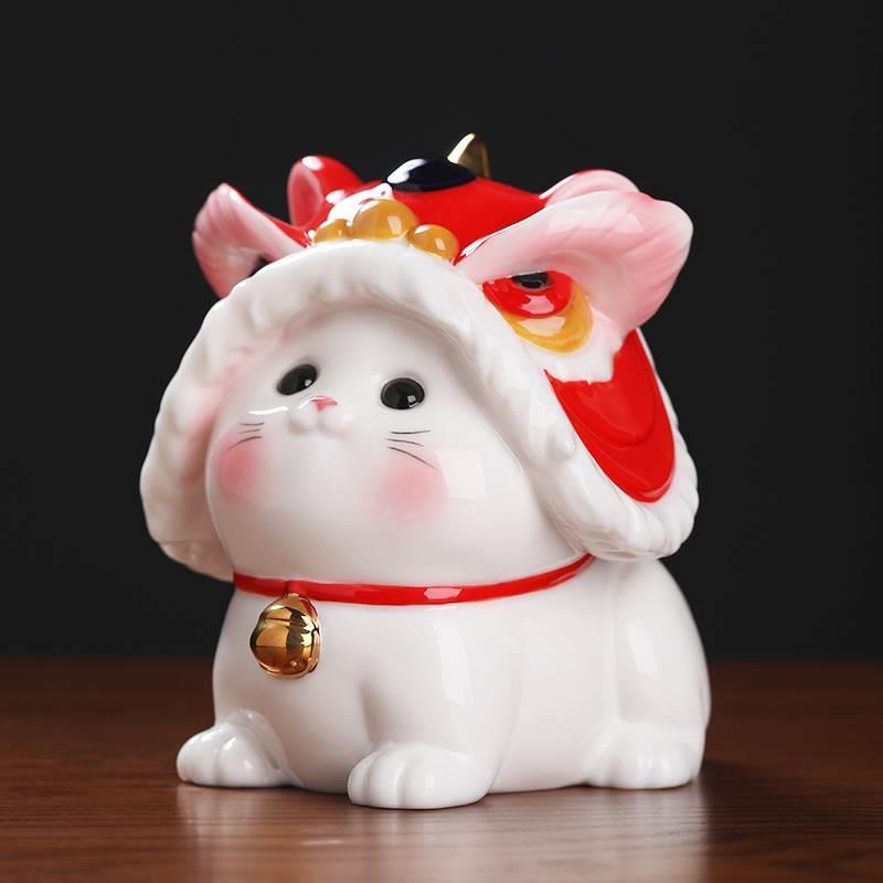 东方泥土陶瓷招财猫小摆件中式客厅办公室桌面国潮红色舞狮装饰品