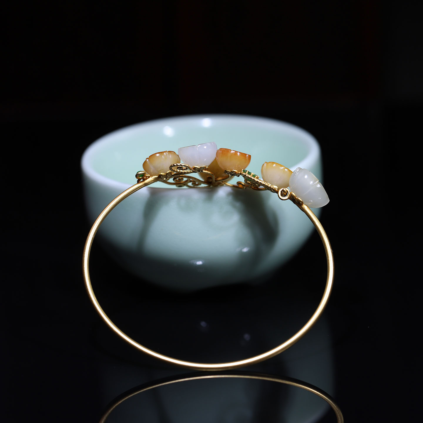 玉秀新疆金镶和田玉花开富贵手镯女款定制手饰苏工籽料羊脂带证书