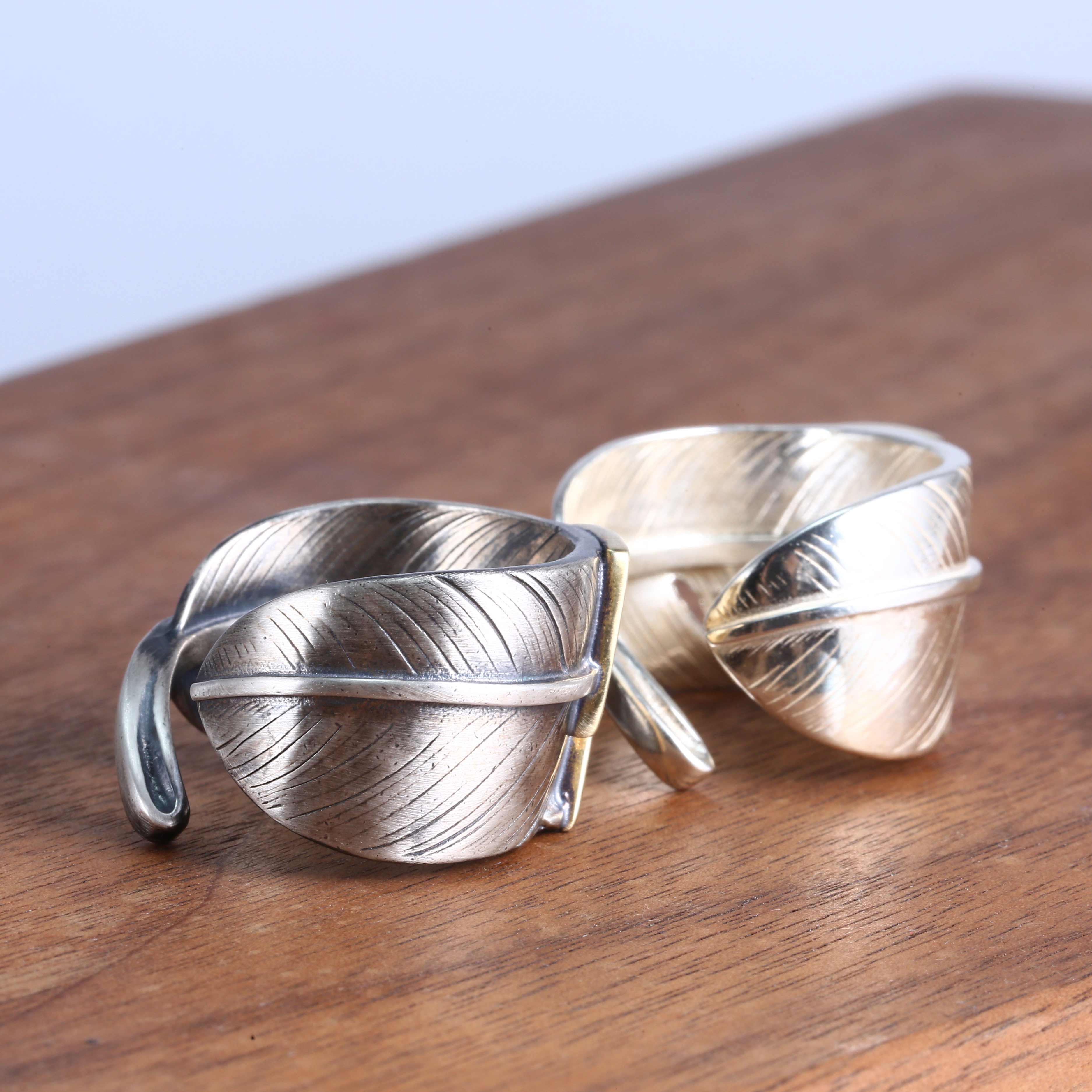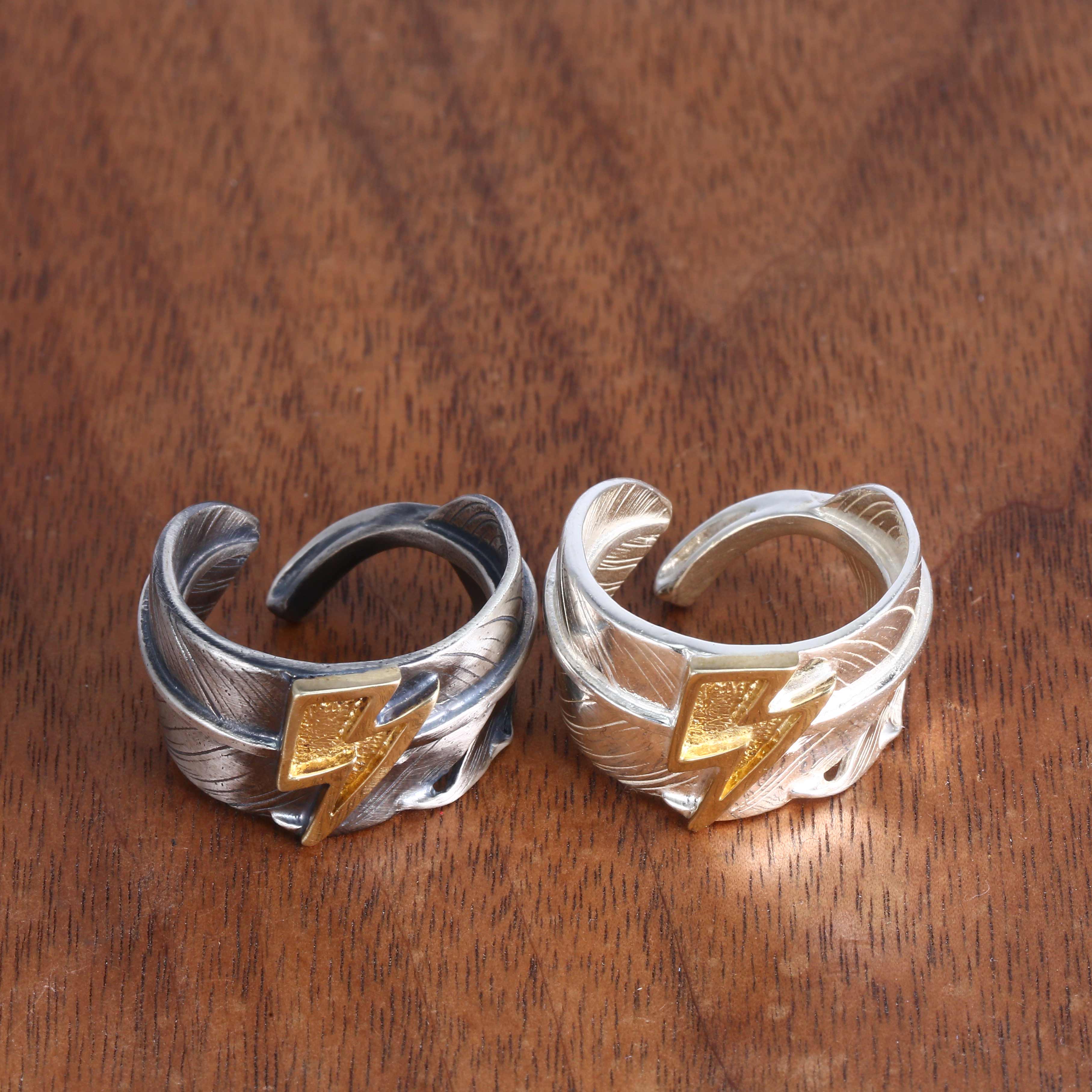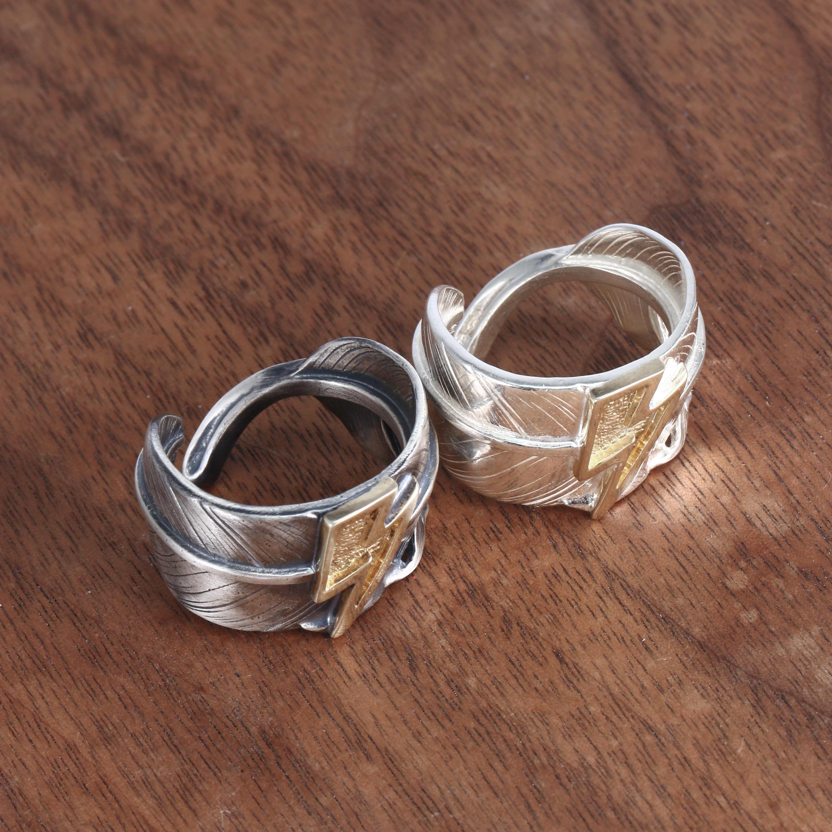 手工银饰金标闪电羽毛戒指925纯银指环男潮