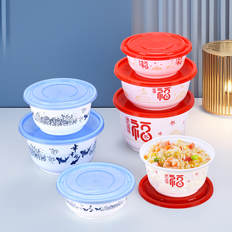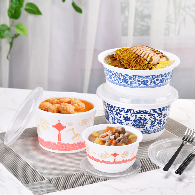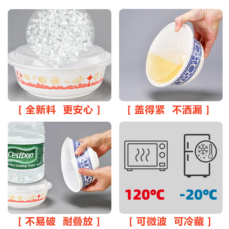 圆形印花一次性碗360ml青花瓷家用汤碗塑料外卖快盒打包饭盒带盖