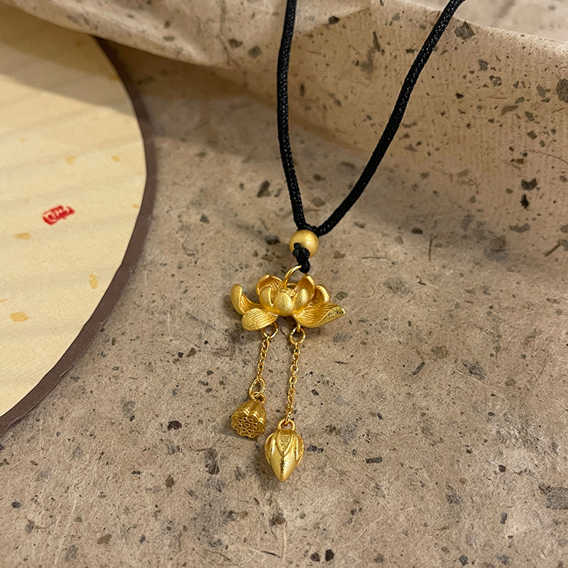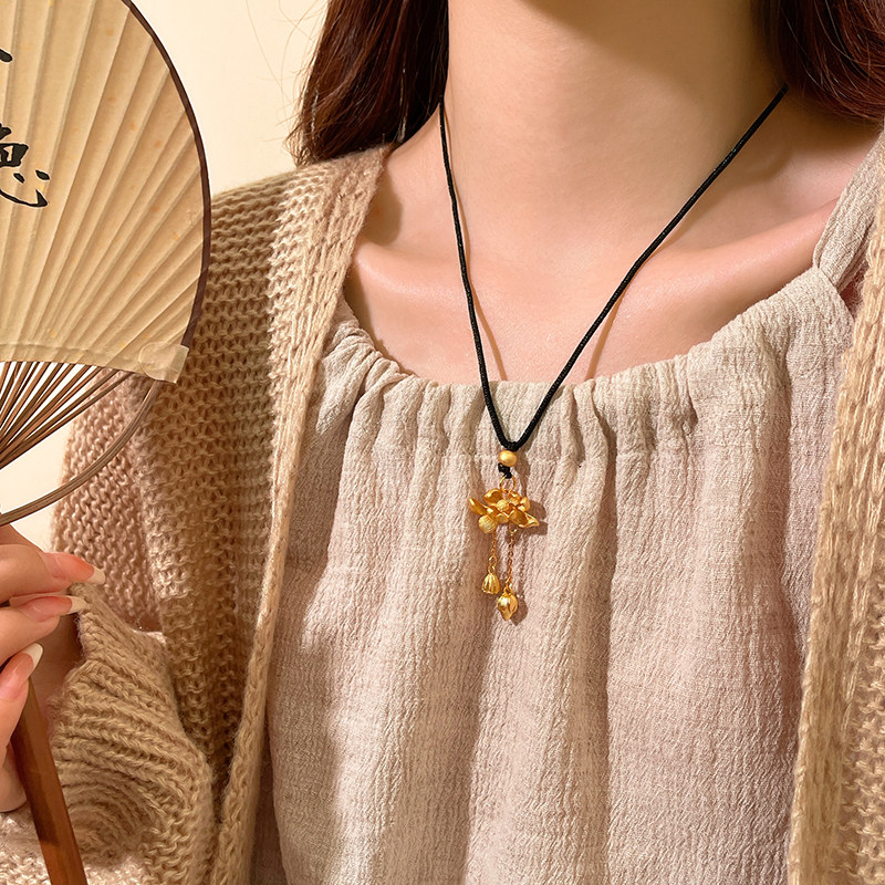 古法荷花莲子流苏吊坠项链女小众设计高级感气质毛衣链编织绳颈链