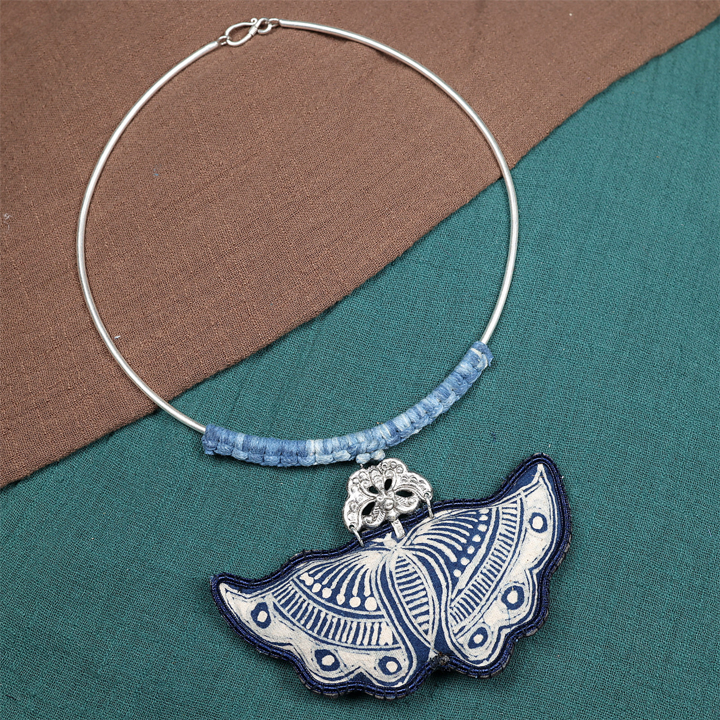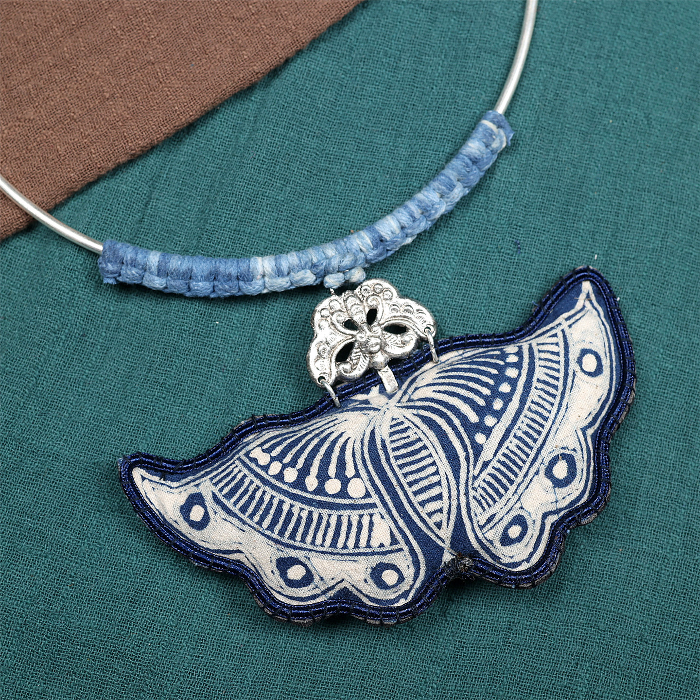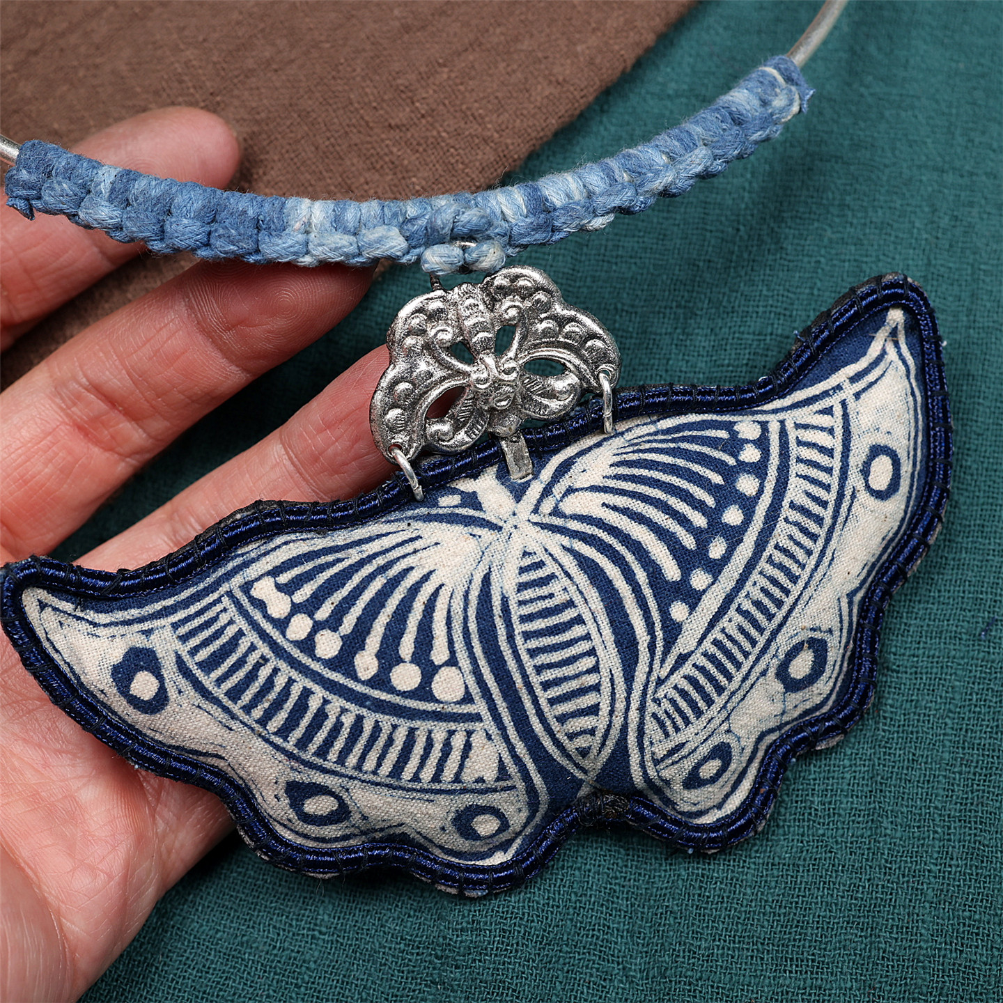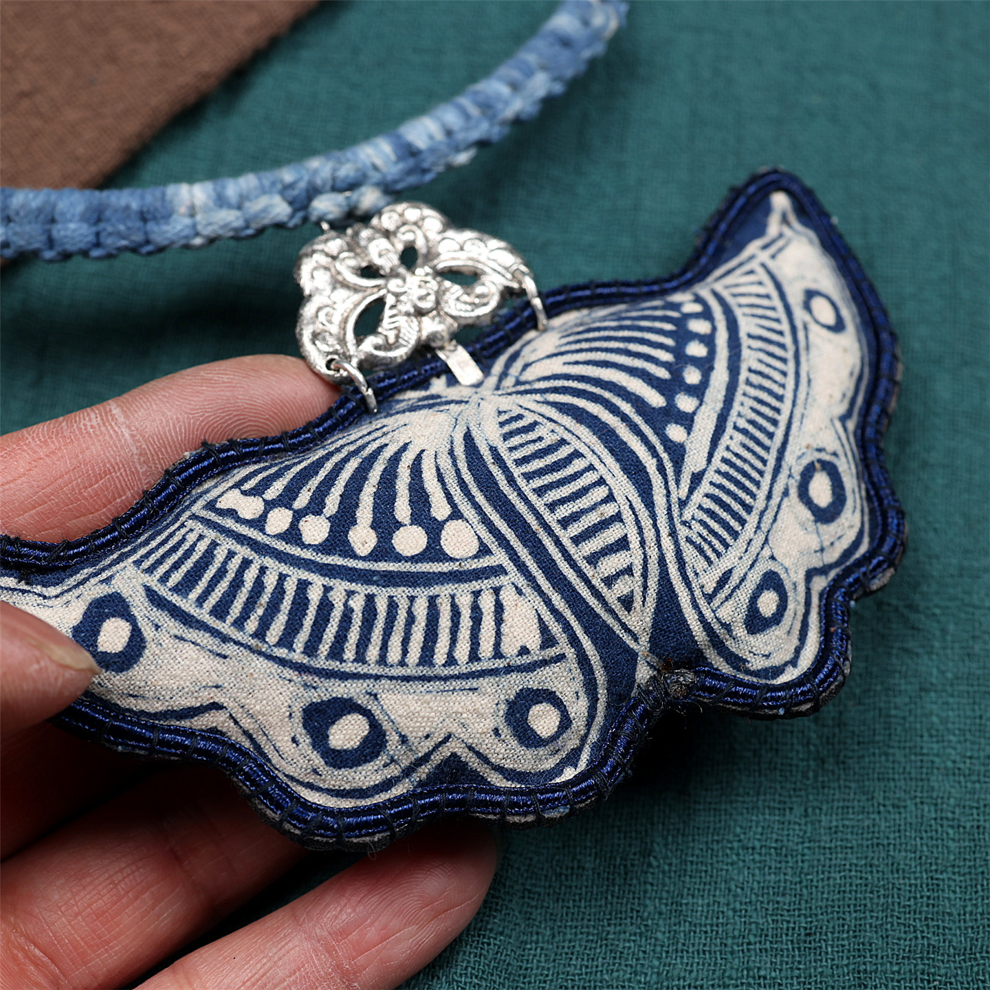 春风屿民族风蜡染蝴蝶吊坠项链女蓝色蓝染编绳锁骨项圈复古颈饰29