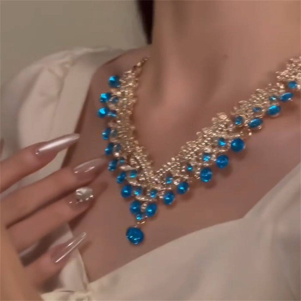 宝蓝色颈链樱桃饰品超闪蓝色锆石项链耳环套装女轻奢高级感晚宴礼