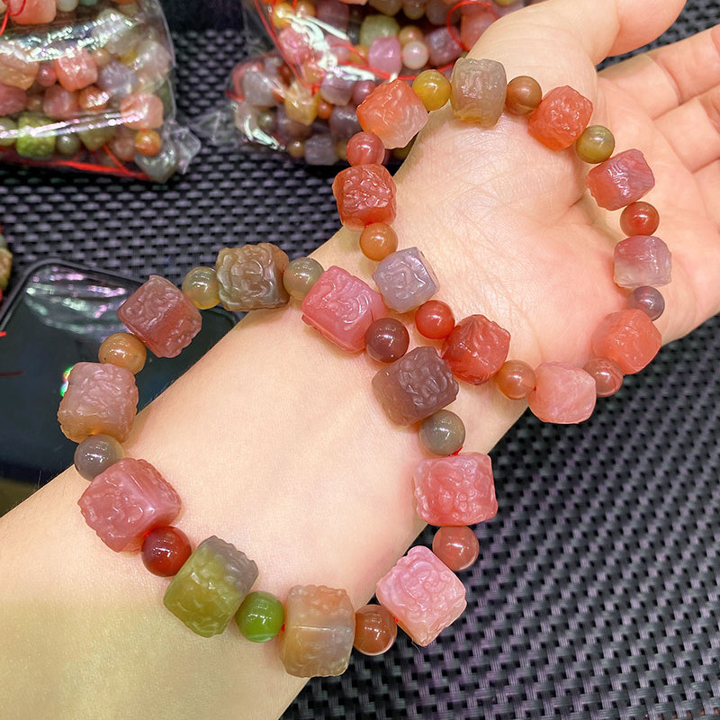精品天然盐源玛瑙凤穿牡丹手链颗颗精雕刻几何方糖玛瑙手串配件珠