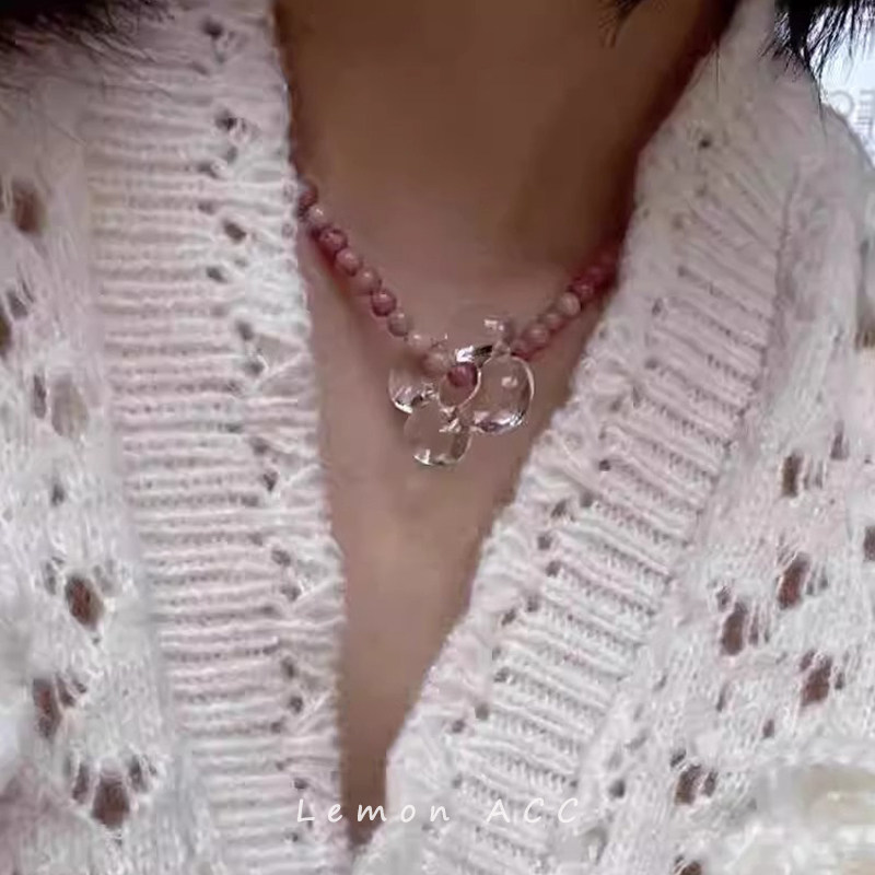 日韩风天然石串珠琉璃花朵项链小众设计黑玛瑙红纹石珠甜酷颈链女