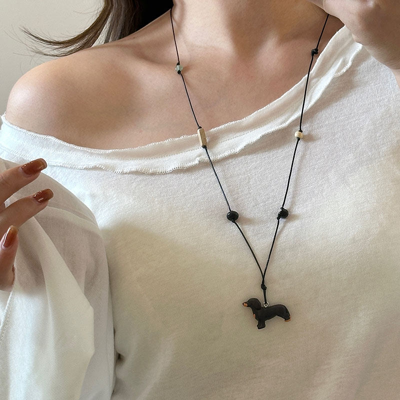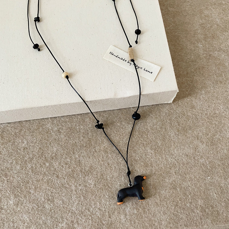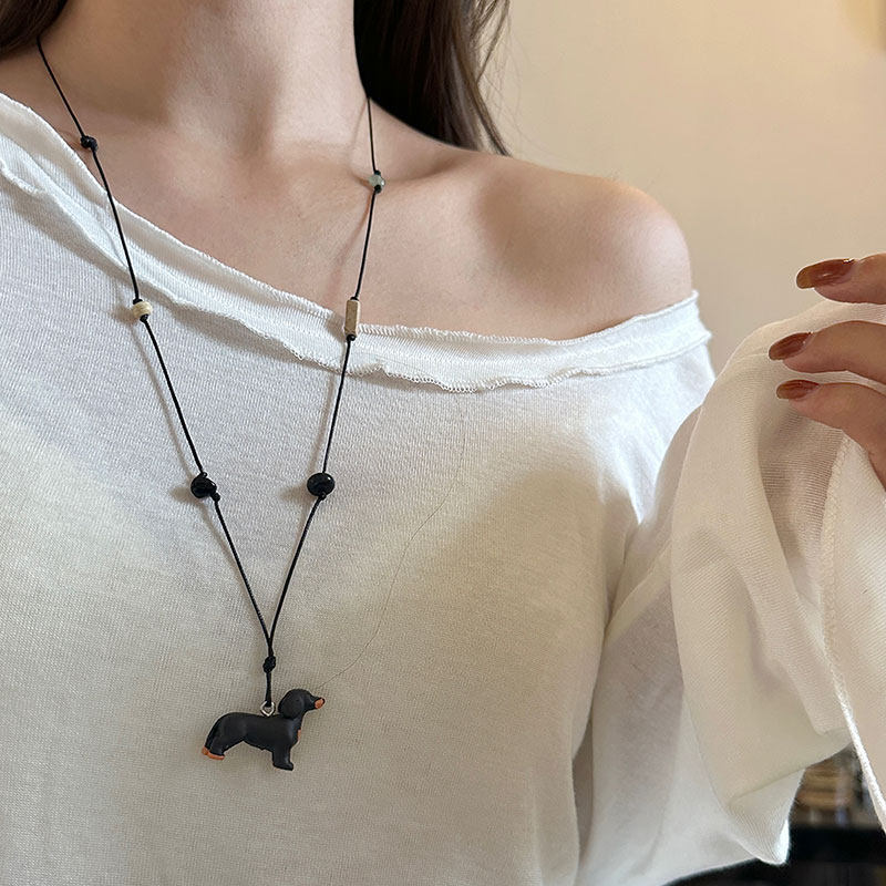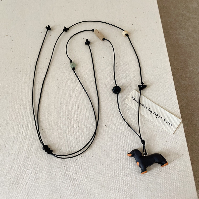 立体腊肠狗天然石黑绳长款项链女文艺复古气质优雅百搭颈链毛衣链