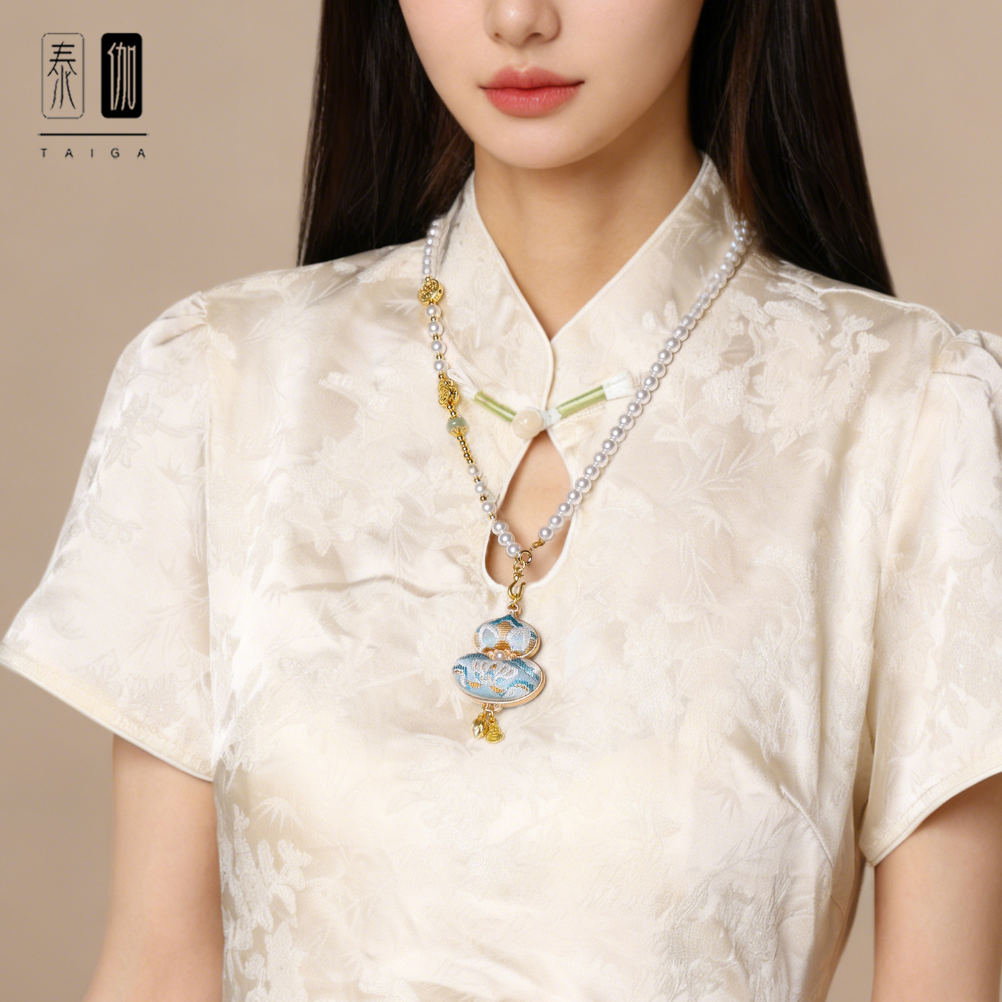 星澜双面宋锦项链年莲吉祥坠系列珍珠贝挂链汉服旗袍配饰链天蓝色