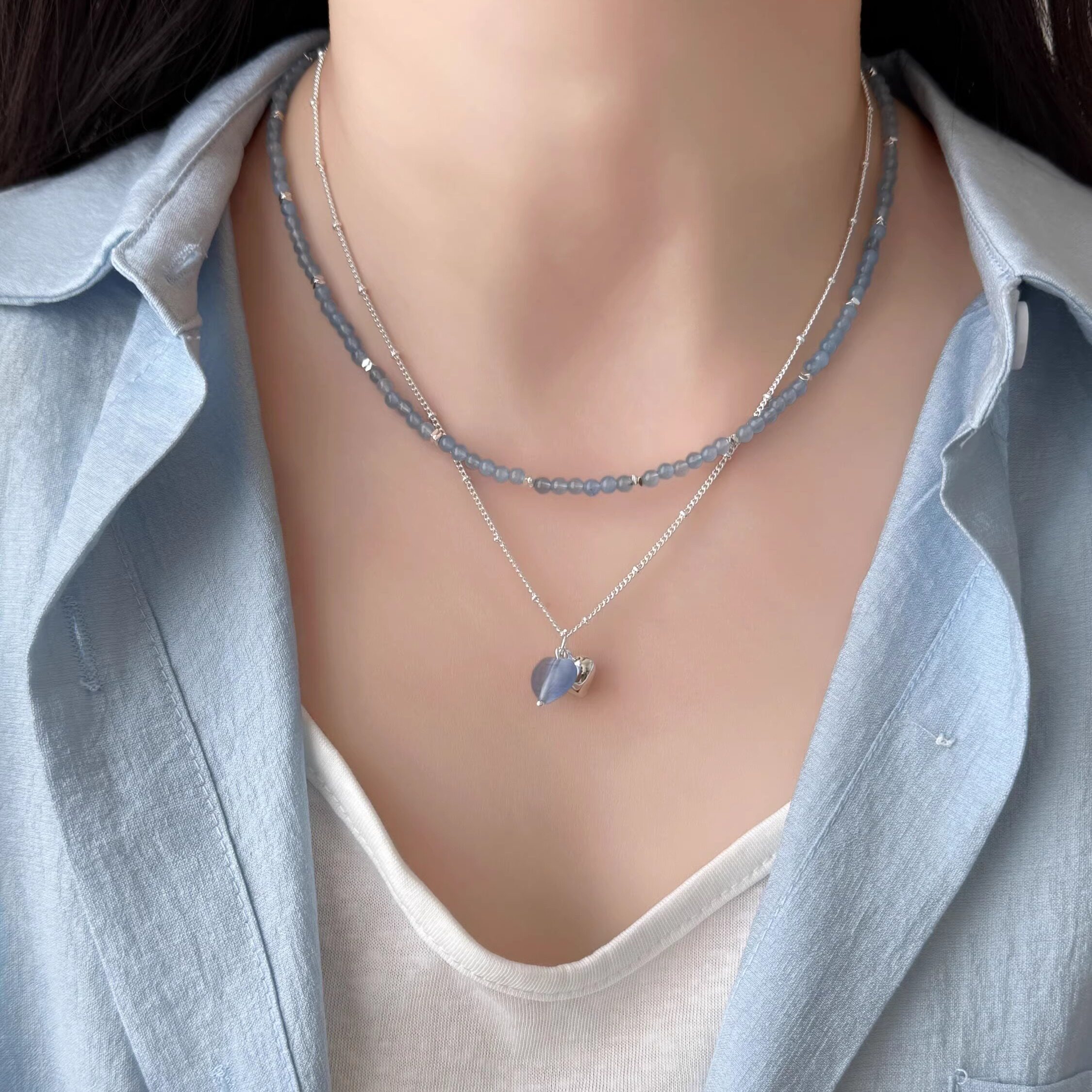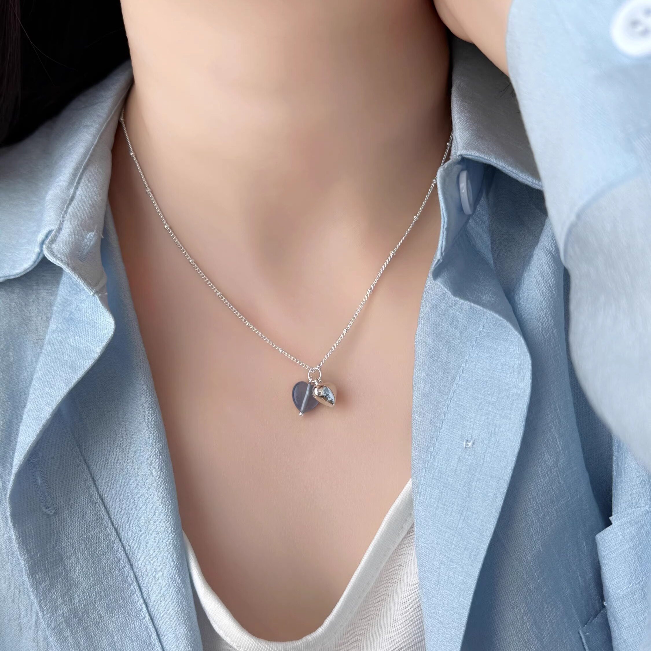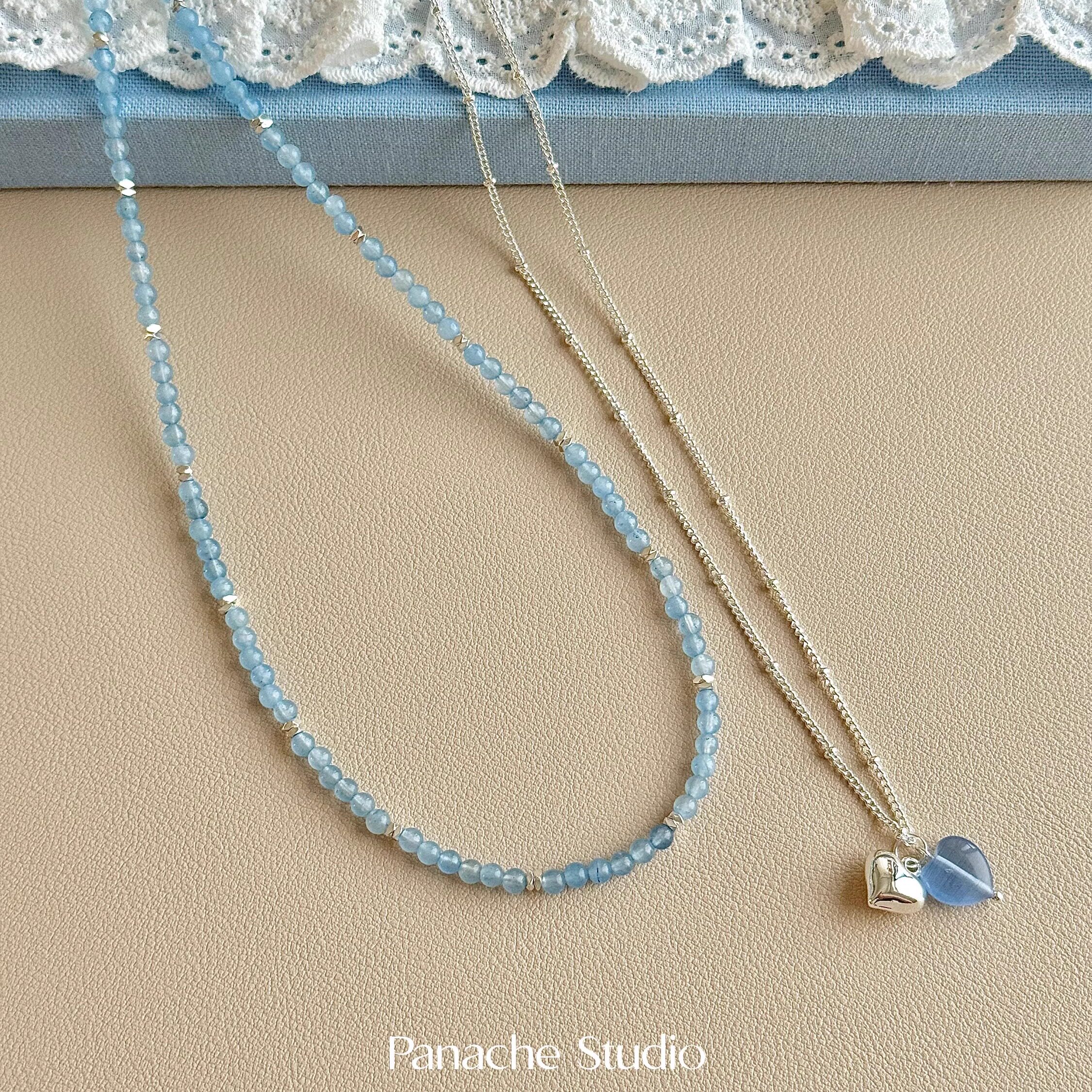 PANACHE 蓝色系双色爱心海蓝碎银子项链小众韩系气质可叠戴锁骨链