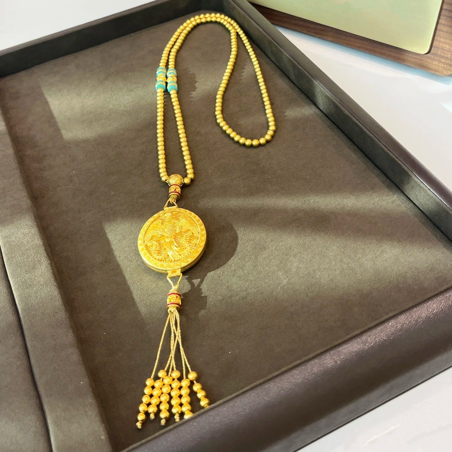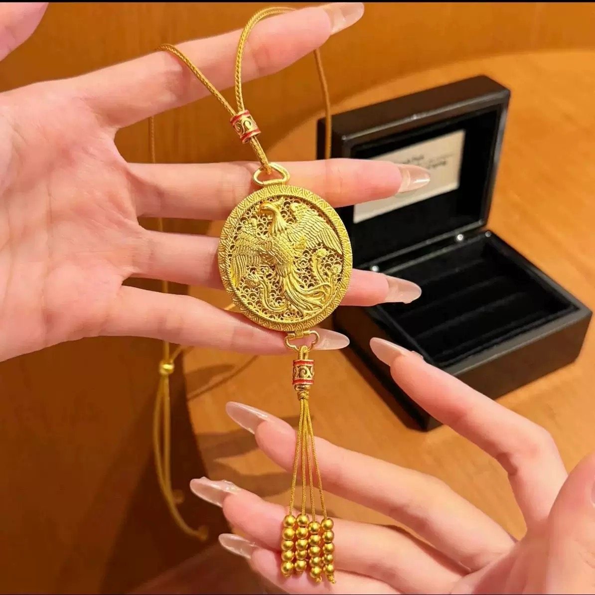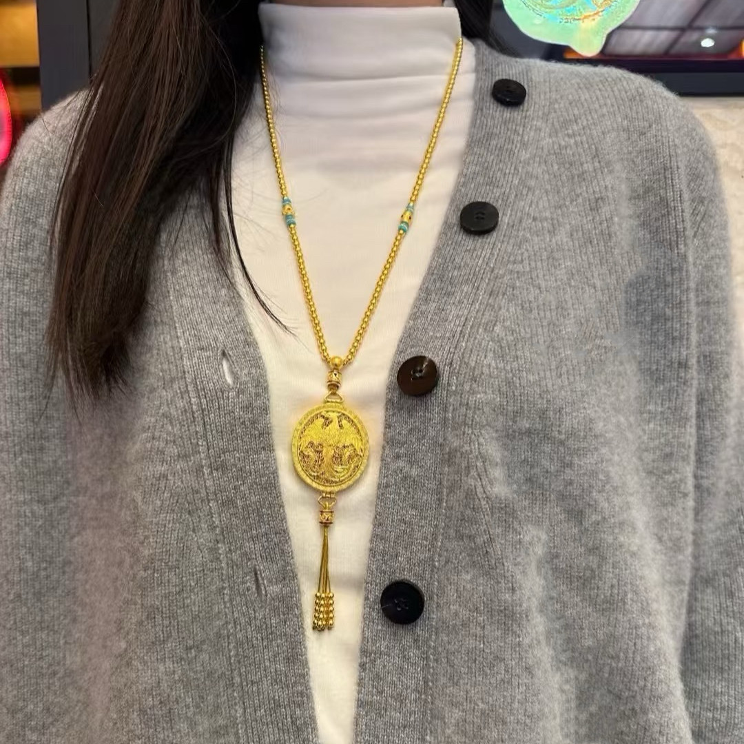 镂空花丝金凤香囊吊坠蓝色女仿真黄金沙金凤凰于飞流苏毛衣链项链