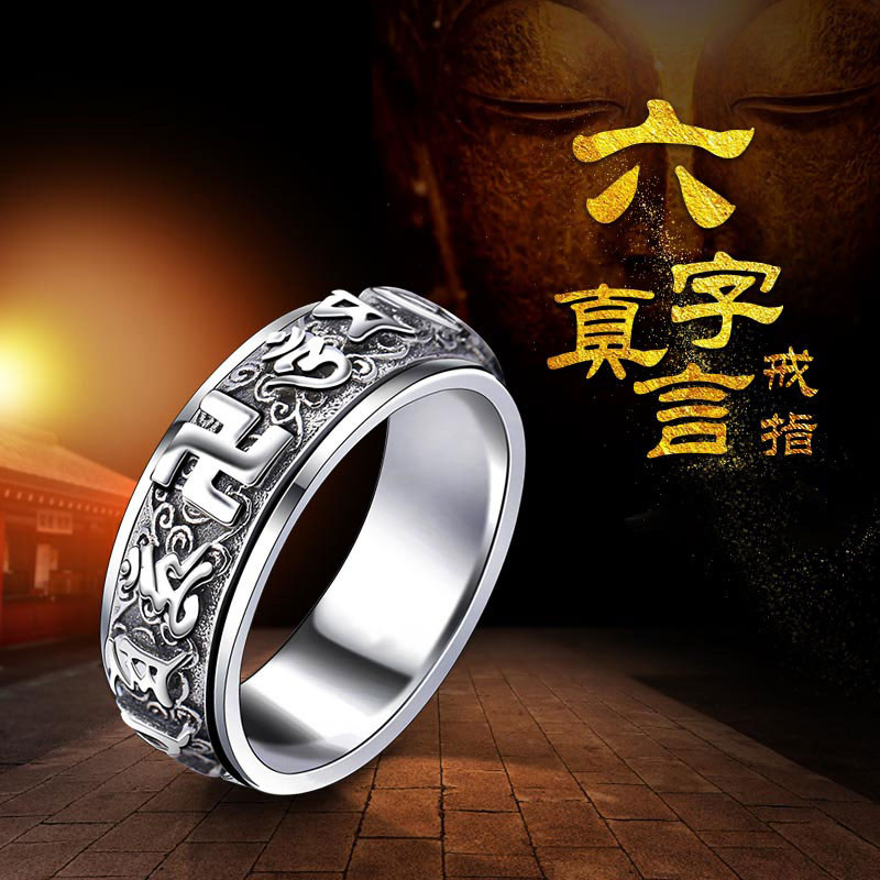 钛钢转动戒指六字真言男士食指大明咒单身潮男成熟个性指环男复古