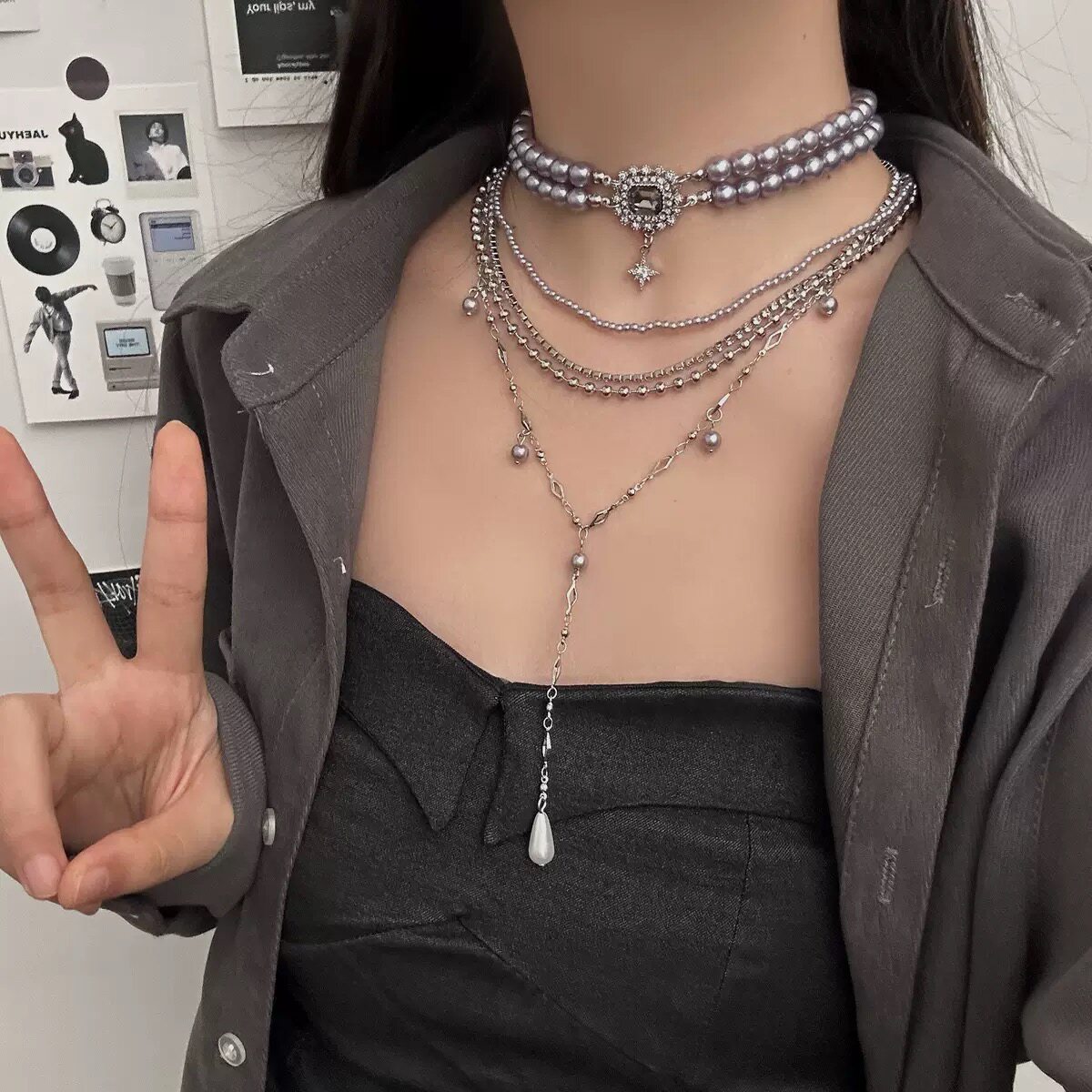 多层珍珠叠戴灰色串珠流苏项链女复古小众choker锁骨链高级感配饰
