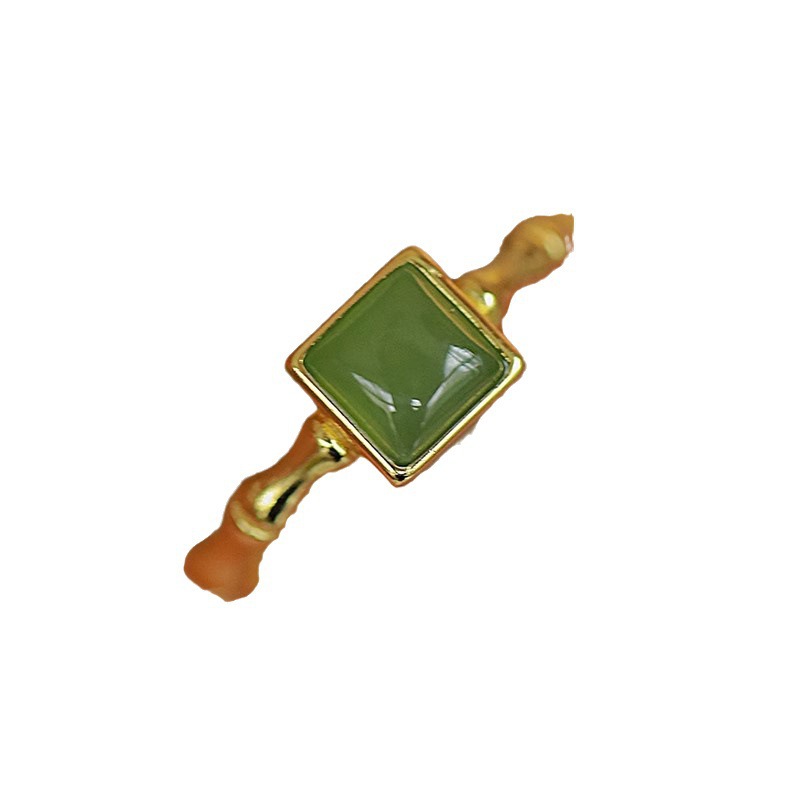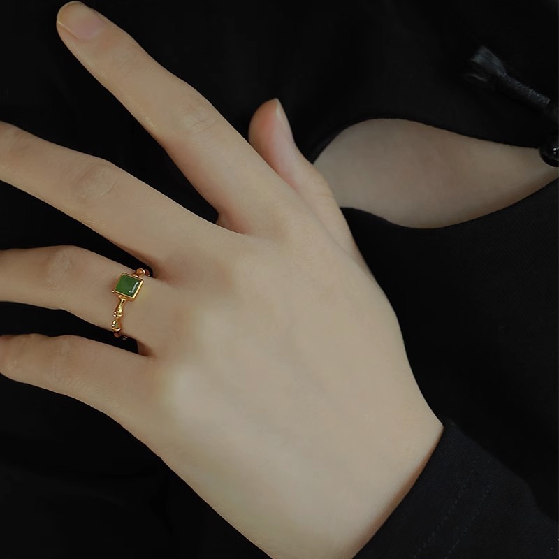 新款新中式落青竹绿色石头戒指女设计感时尚个性国潮方形戒指