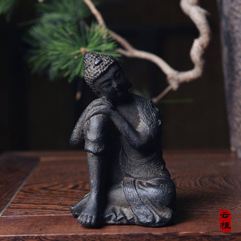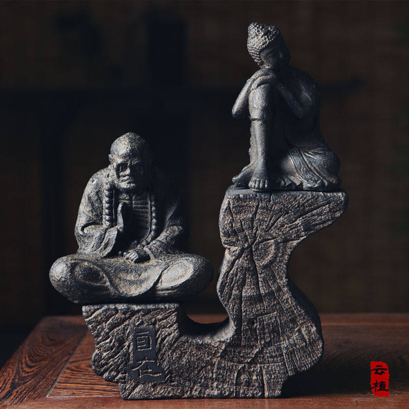 仿古仿石禅意国风摆件睡佛达摩文房案台雅物高端装饰家居水培花盆