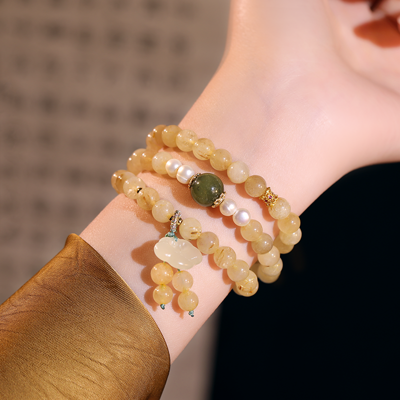 多层叠戴黄水晶手链女祥云锁吊坠串珠2025年新款招财转运手串手饰