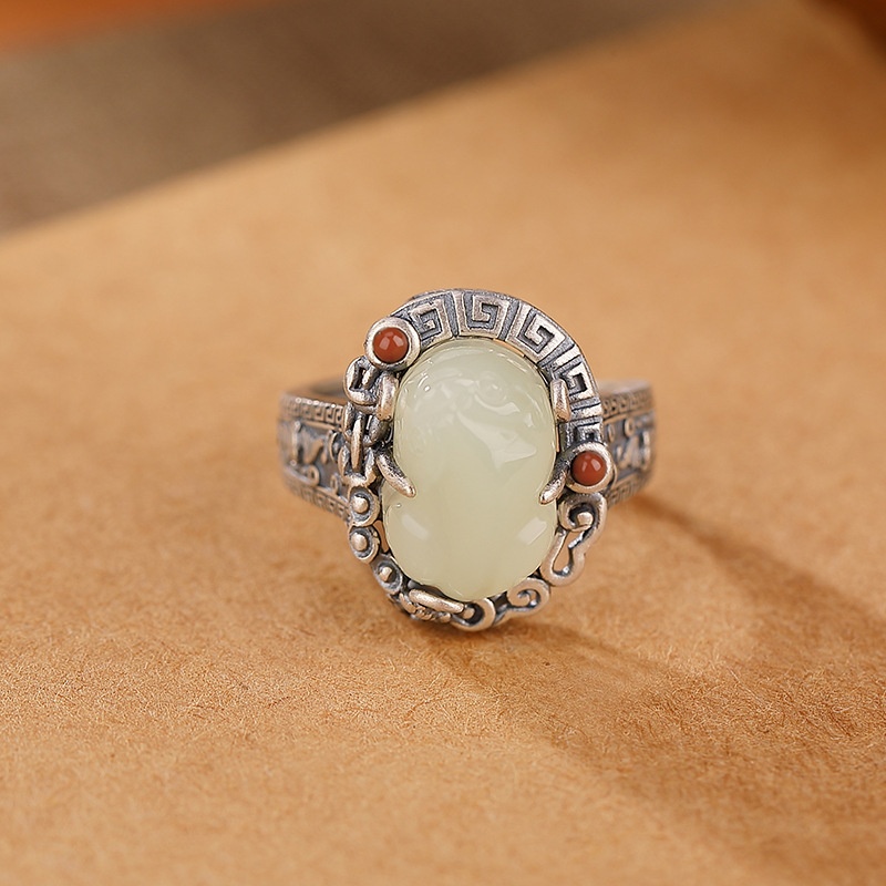 锦河畔 s925纯银和田玉貔貅戒指创意礼物复古国风设计感小众银