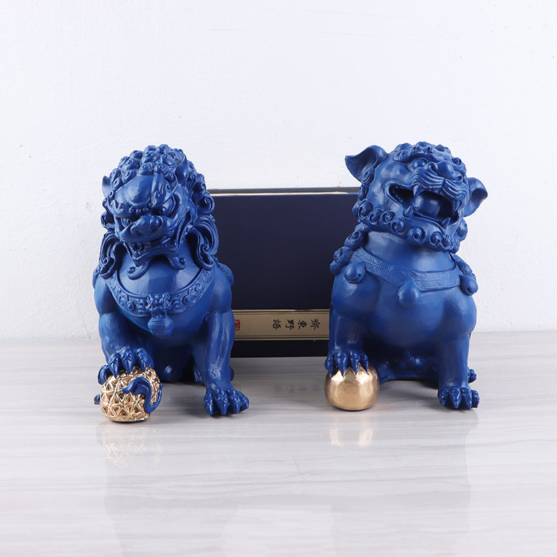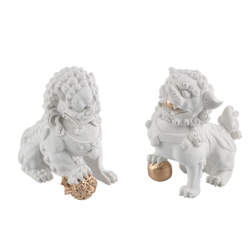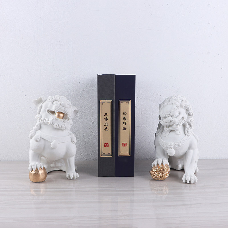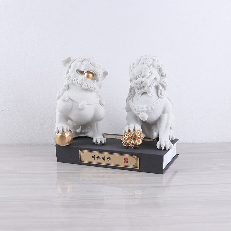 现代新中式蓝白色狮子摆件样板房间书房博K古架玄关柜桌面软装饰