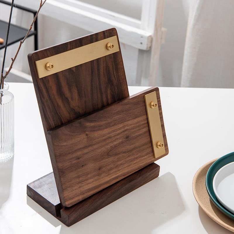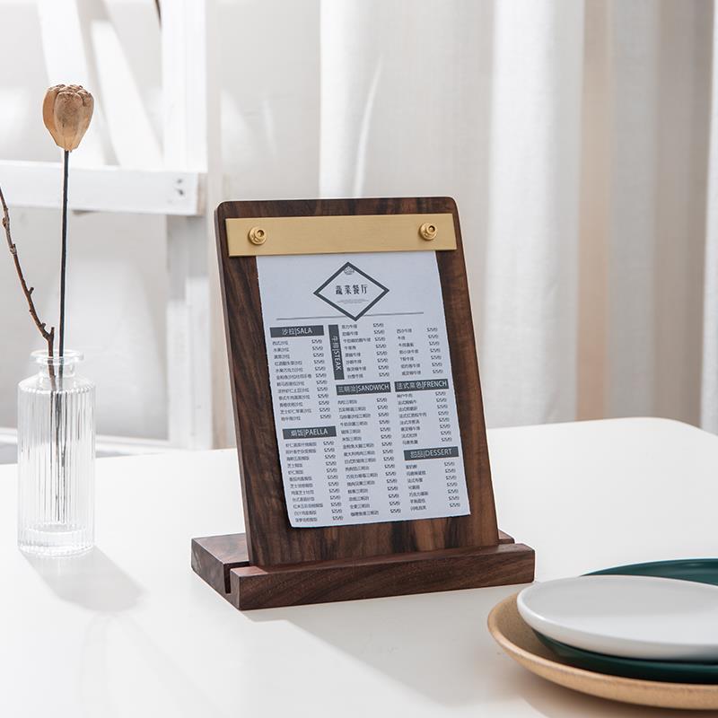 胡桃木复古菜单夹板展示架黄铜创意咖啡餐厅设计酒水点单立式桌牌