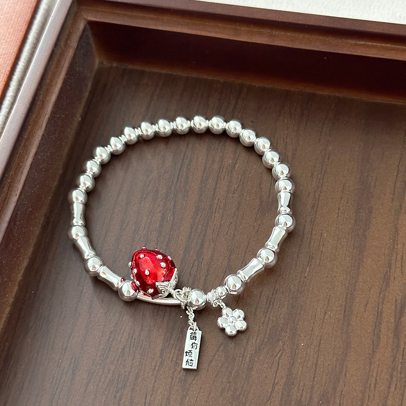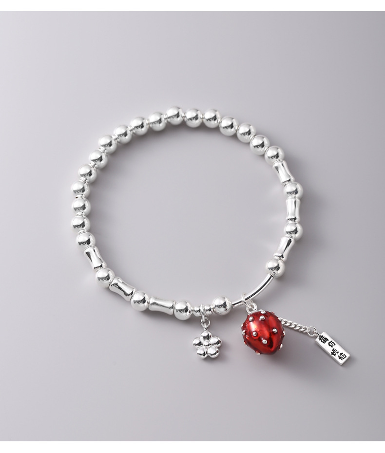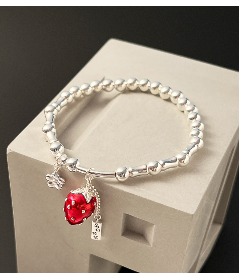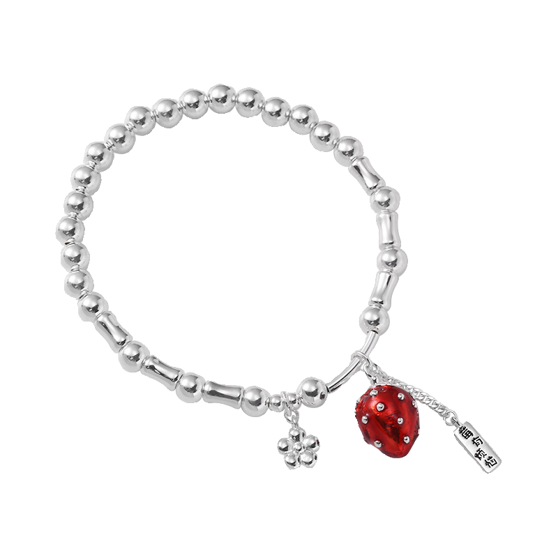 【莓有烦恼】通体925纯银手链女红色滴油草莓长牌银珠弹力绳手串