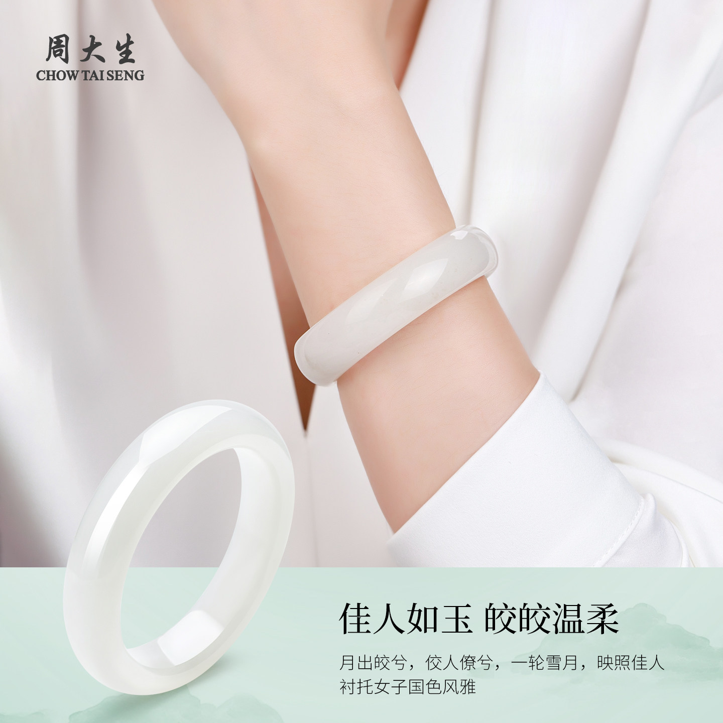 周大生官方和田玉白玉手镯女款羊脂玉平安镯温润传世高端生日礼物