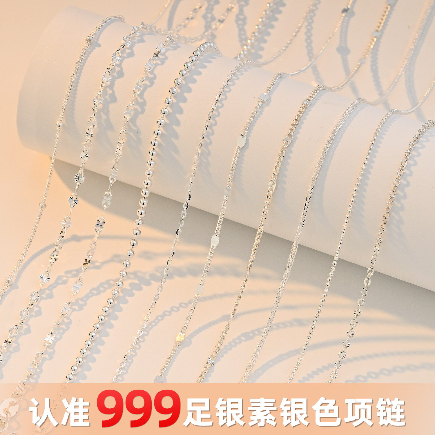 纯银毛衣链999足银项链银素链W扣锁骨链素银色细颈链银白色肖邦链