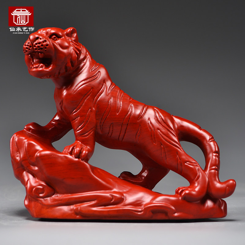 热销红色木雕老虎摆件实木质上山虎生肖工艺品家居办公桌面装饰工