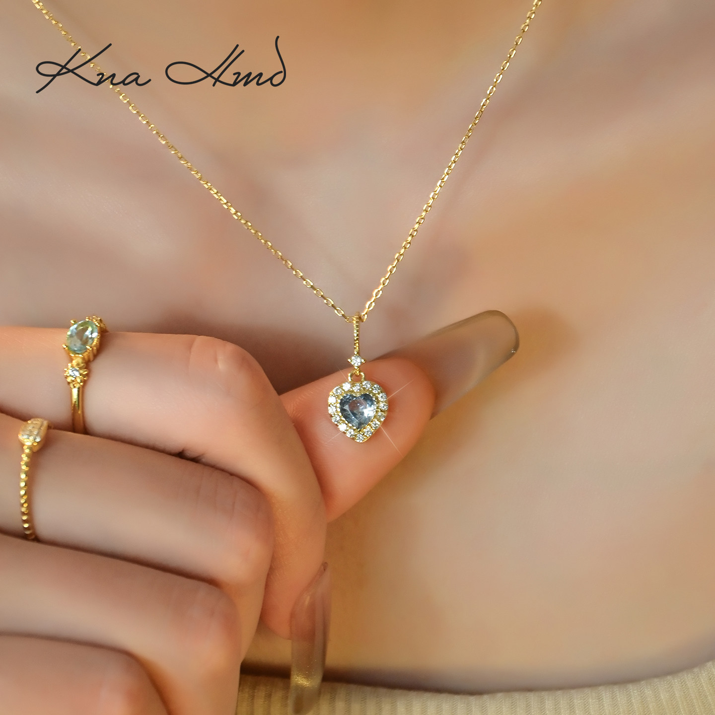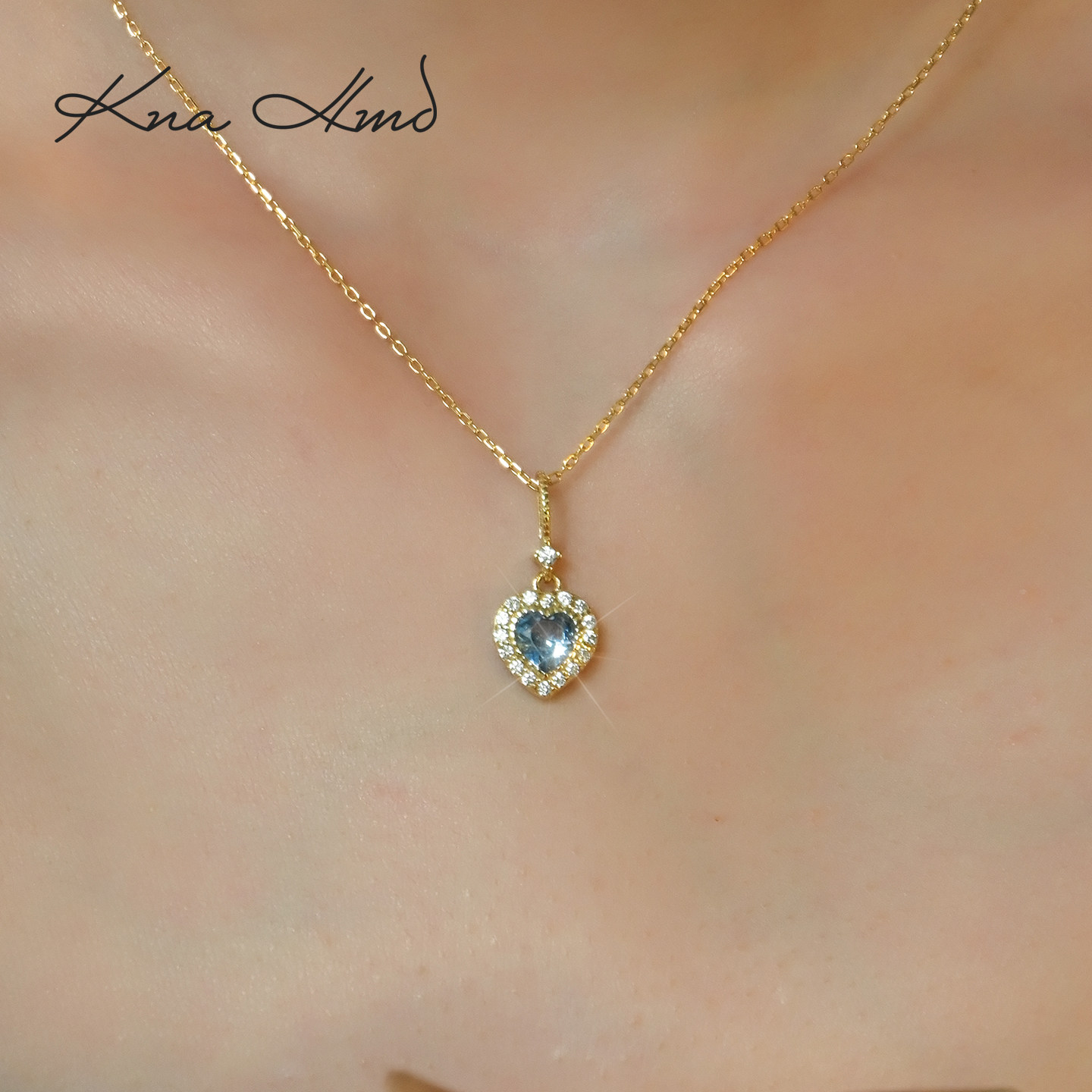 KNA珂娜「海蓝之心」海蓝宝石吊坠项链女S925纯银爱心锁骨链项链