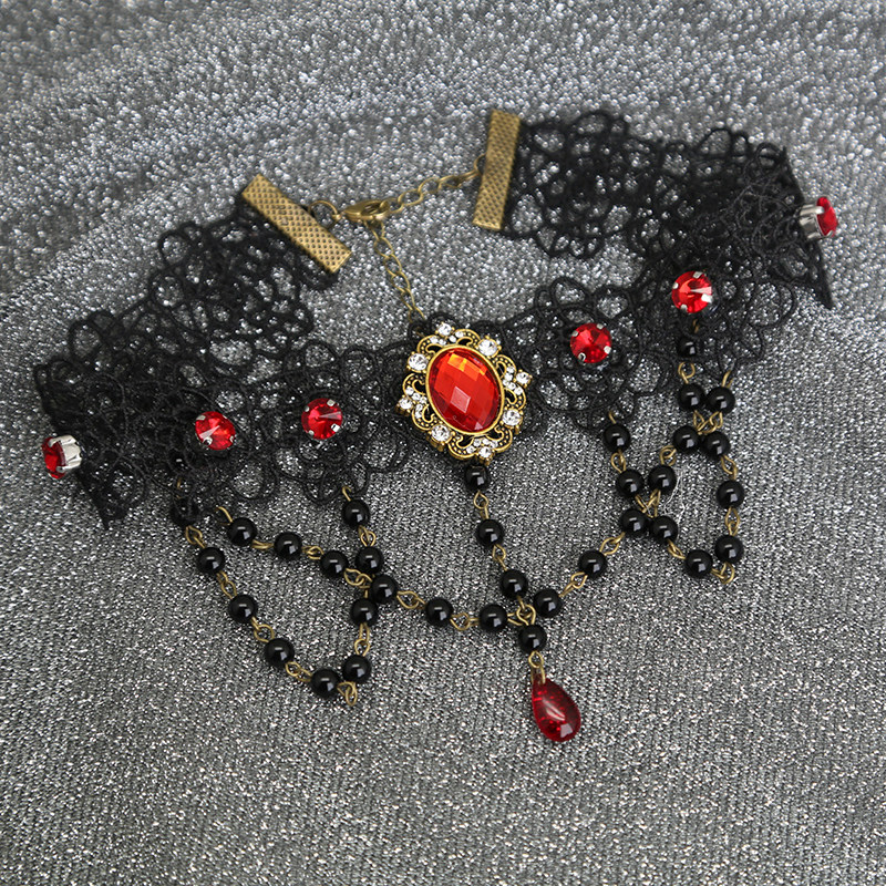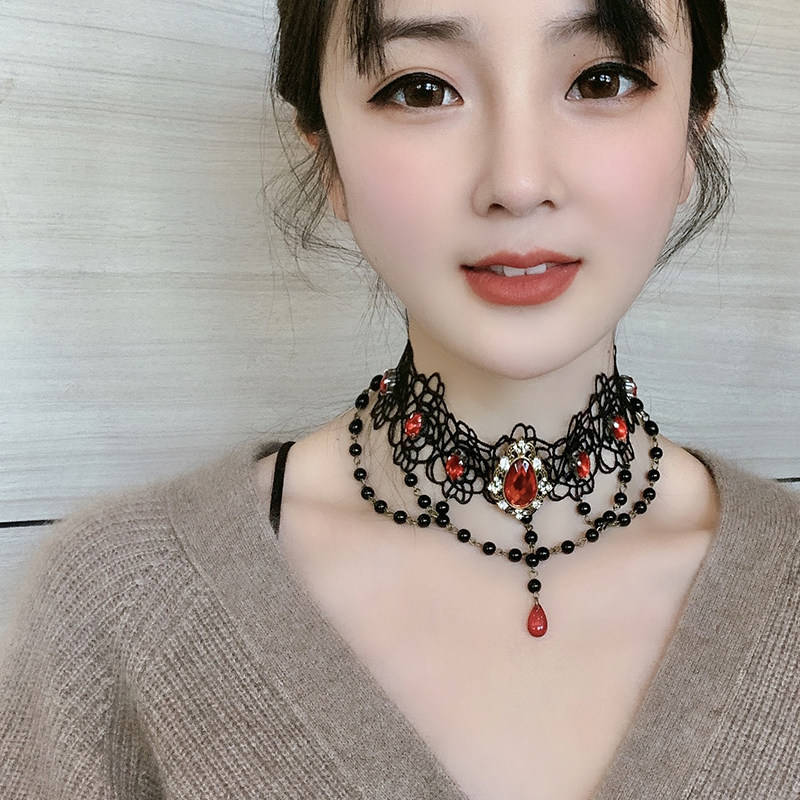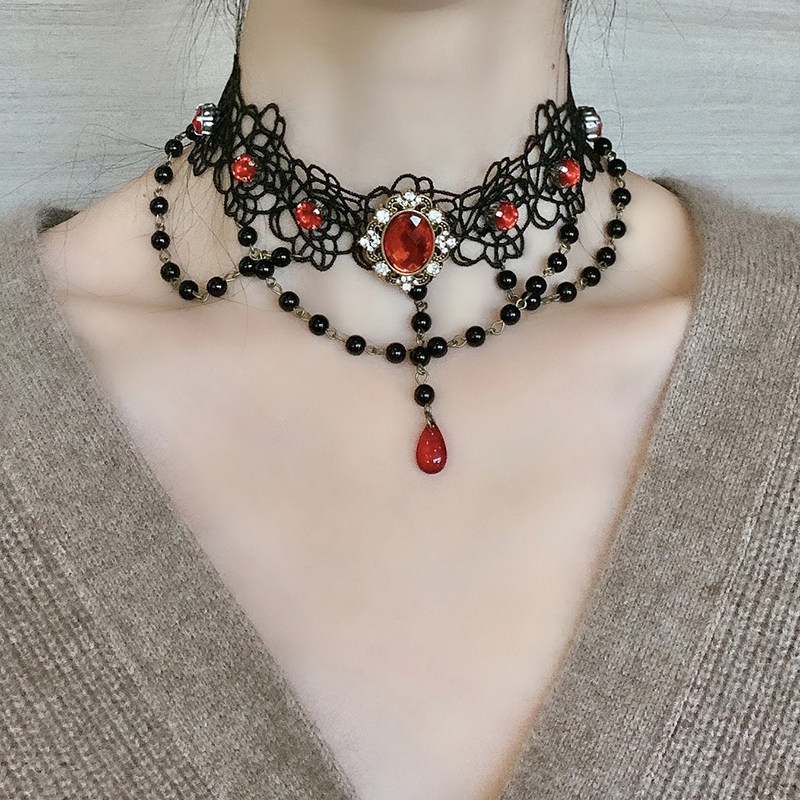 艾米米原创手工复古宫廷哥特网红短款时尚蕾丝水红晶颈链锁骨项链