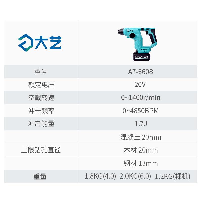 大艺锂电电锤两用无刷充电冲击钻轻型电钻混凝土电动工具A7-6608