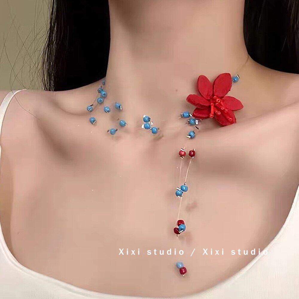 夏日蓝色串珠花朵项链女多巴胺甜美超仙锁骨链温柔百搭颈链配饰品