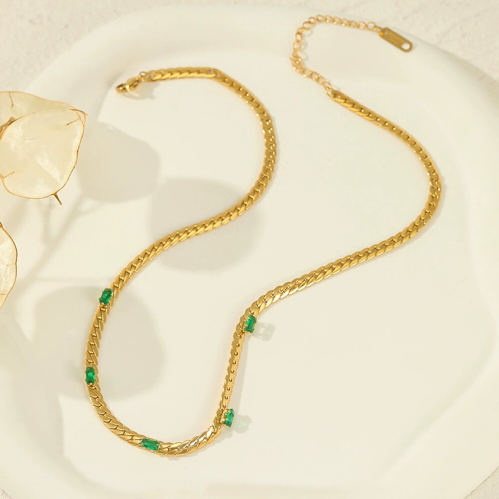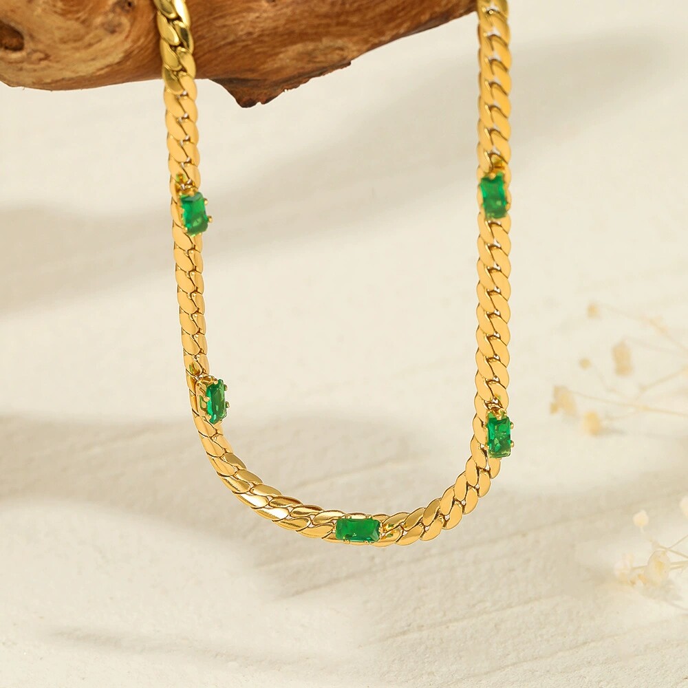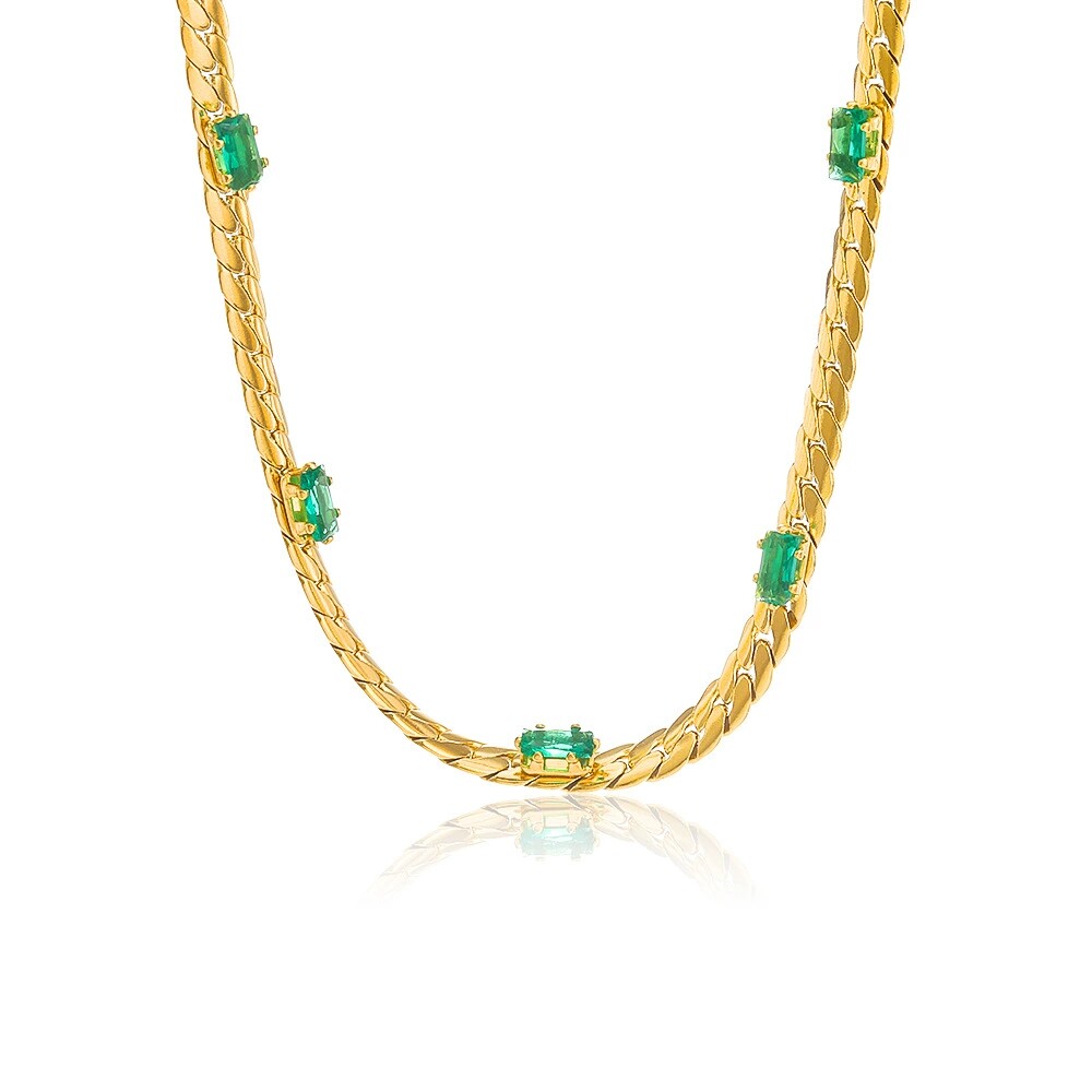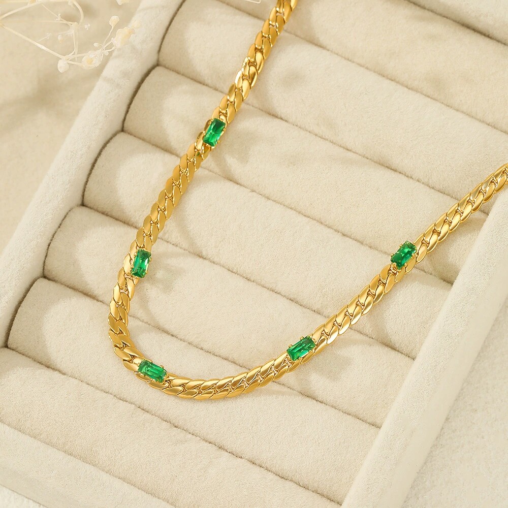 法式优雅复古方形绿色宝石项链14K金不锈钢项链INS风女士钛钢项饰