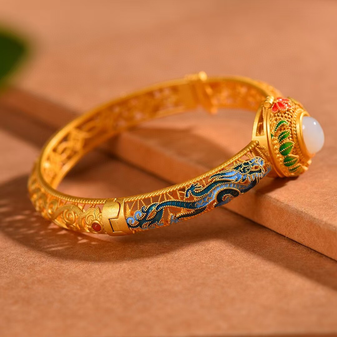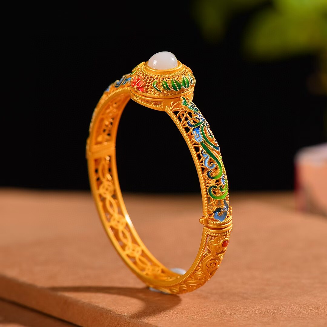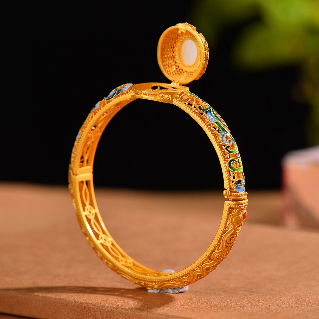 古法银镶和田玉珐琅香囊手镯