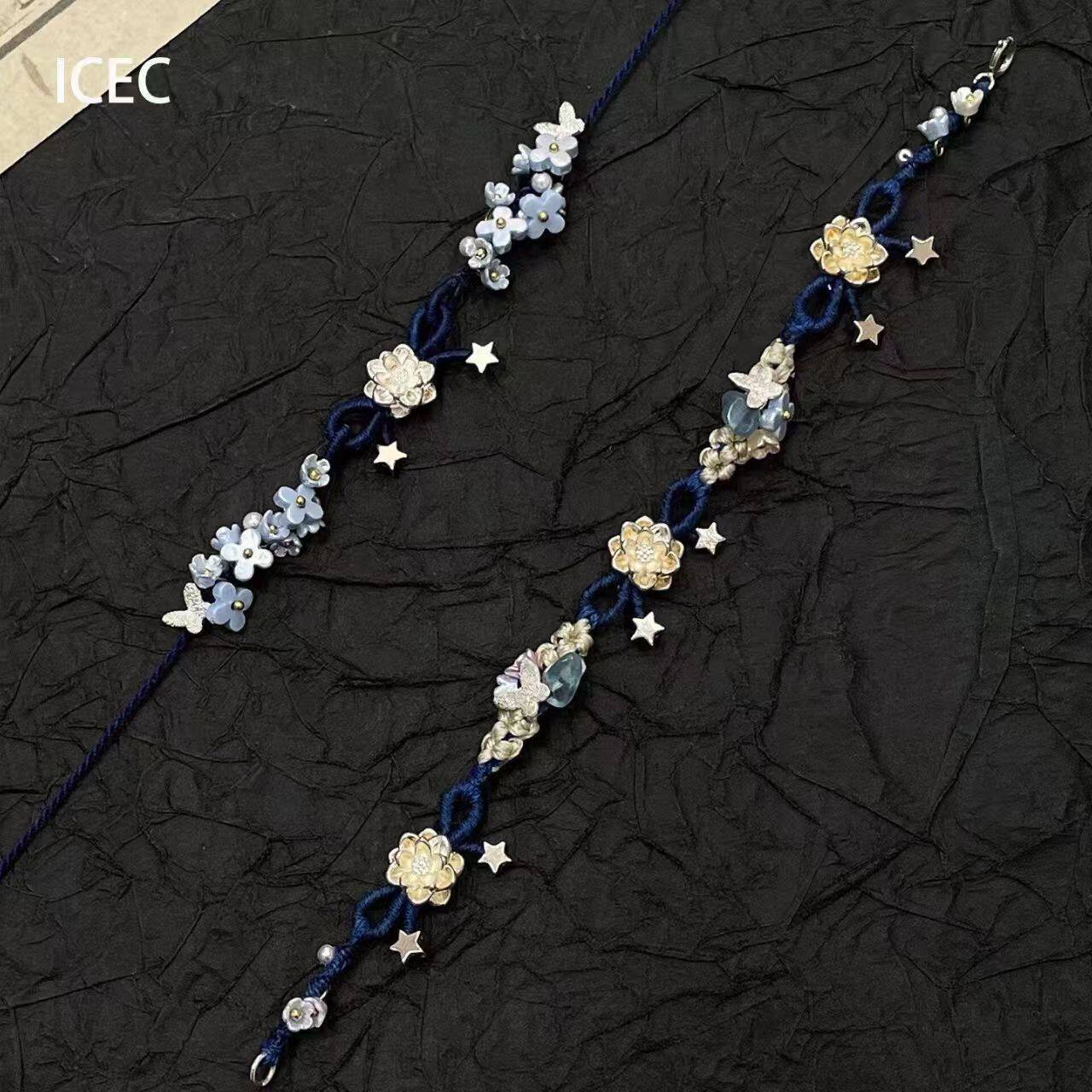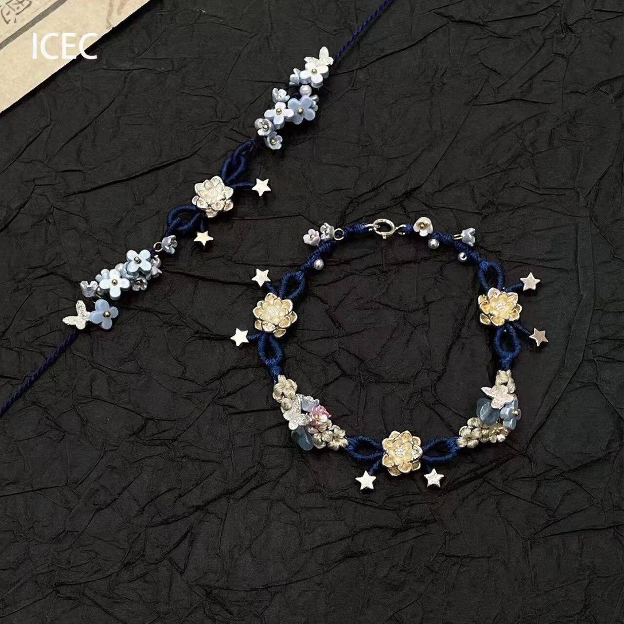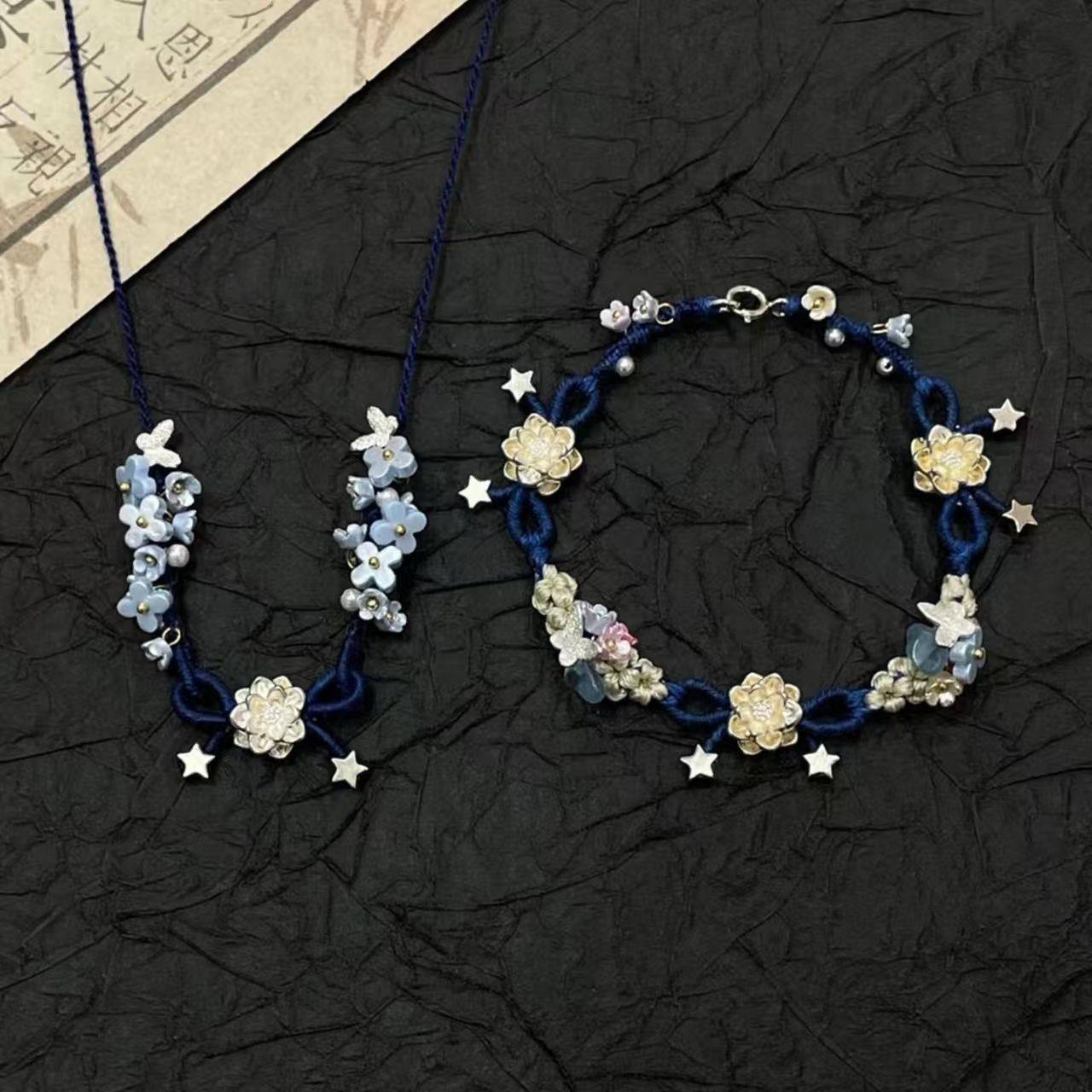 高颜值莲花星星编绳项链女2025新款国风蓝色小众设计感手链送礼物