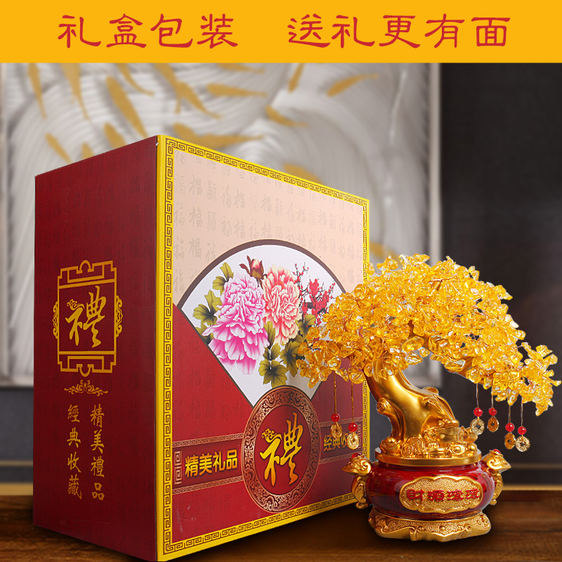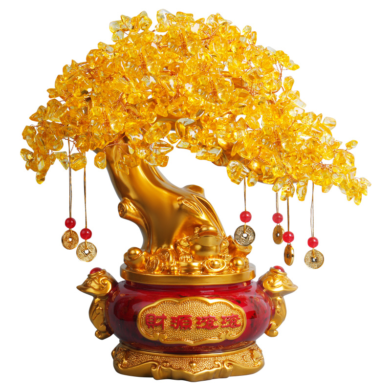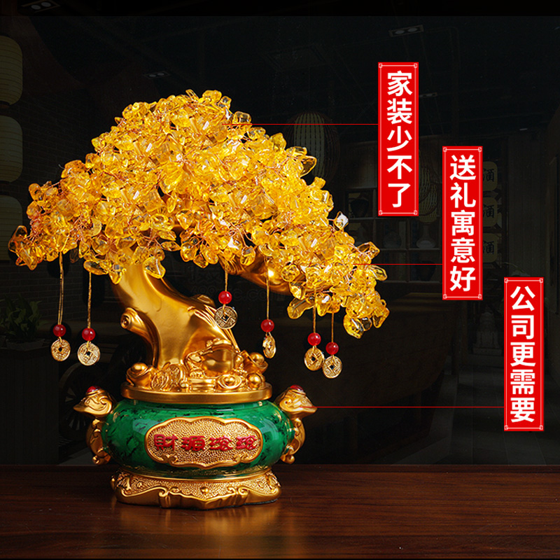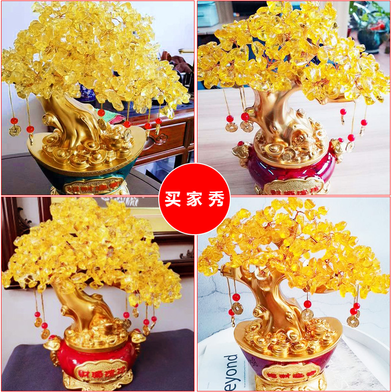 黄水晶发财树摇钱树客厅酒柜装饰品摆件聚宝盆招财树店铺开业礼品