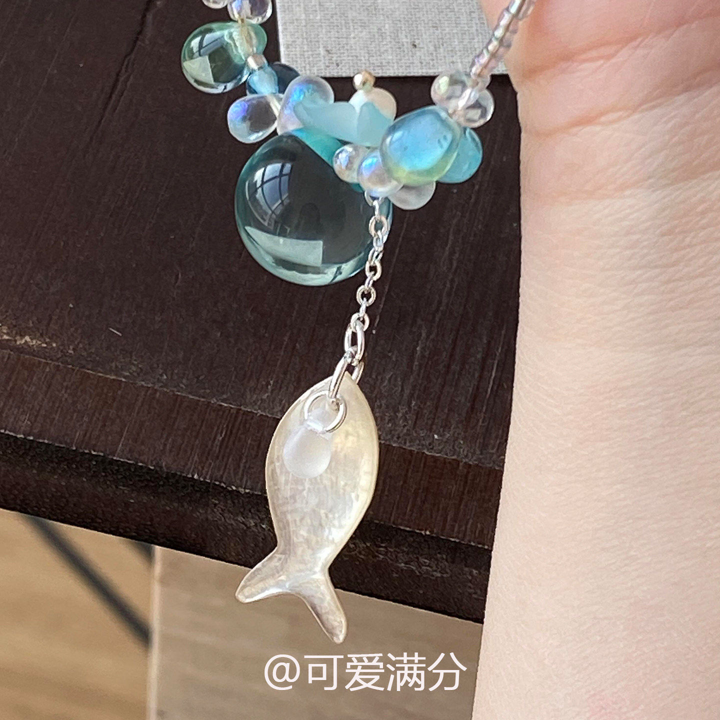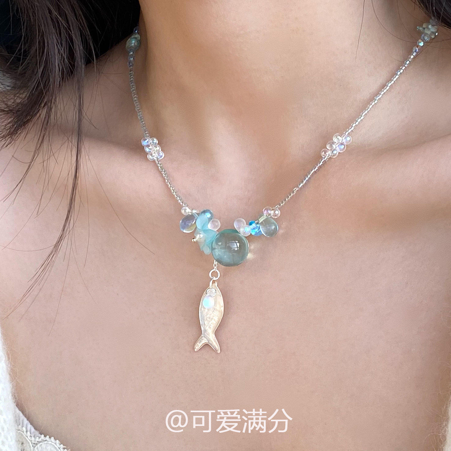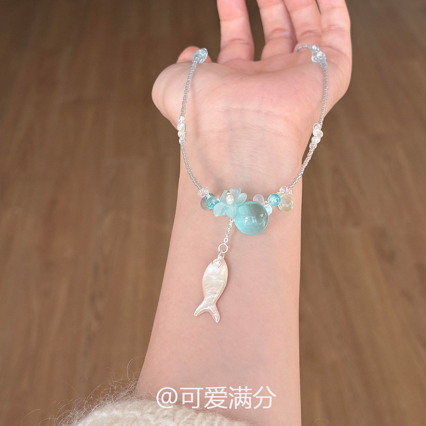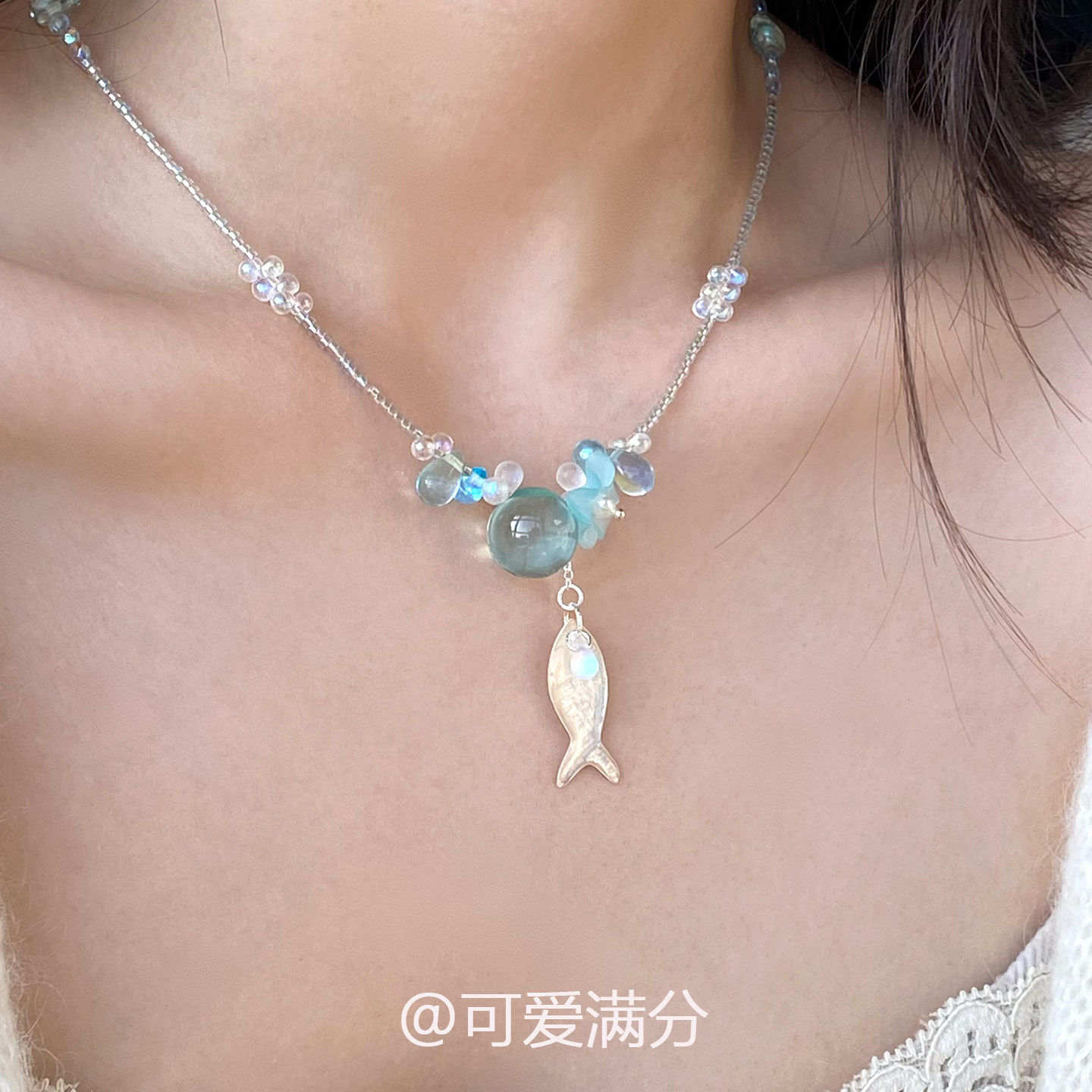 S925纯银蓝色水滴花朵串珠小鱼项链女2026新爆款轻奢高级感锁骨链