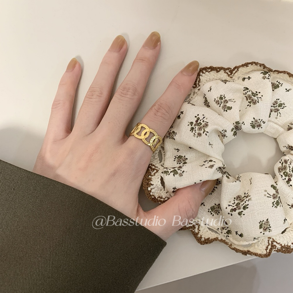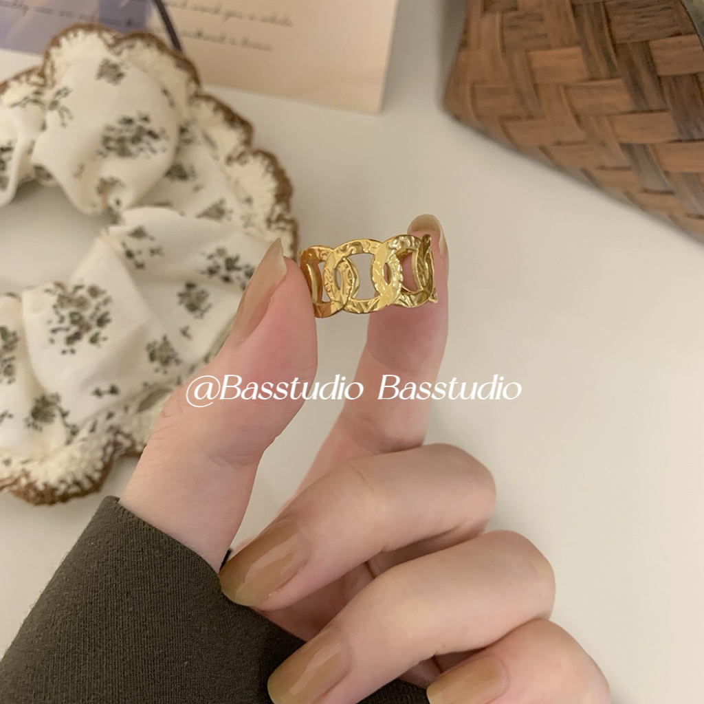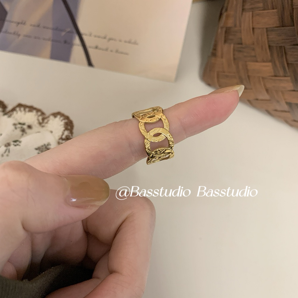 Basstudio 中古时尚气质捶打纹复古小众宽版C形戒指 钛钢镀18K金