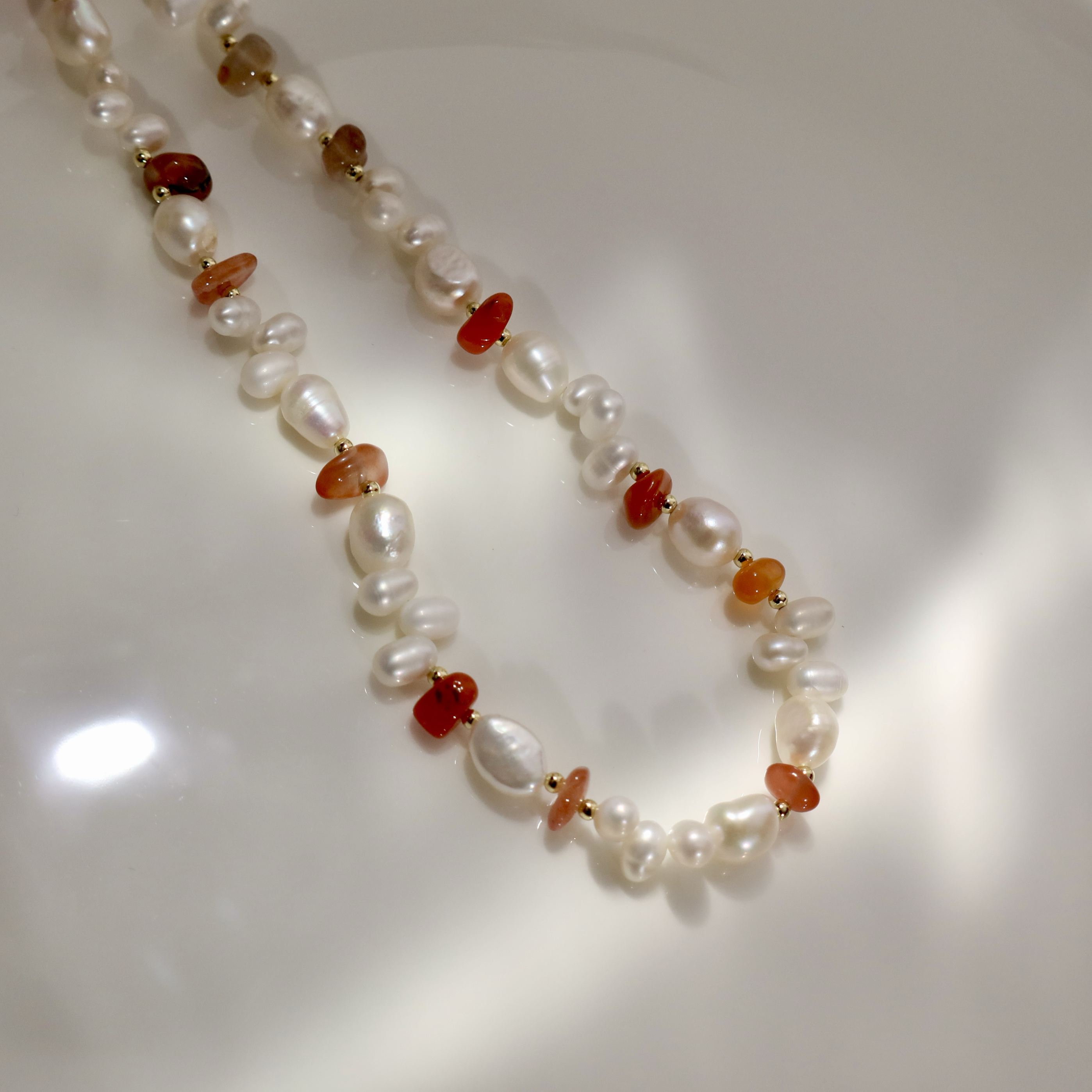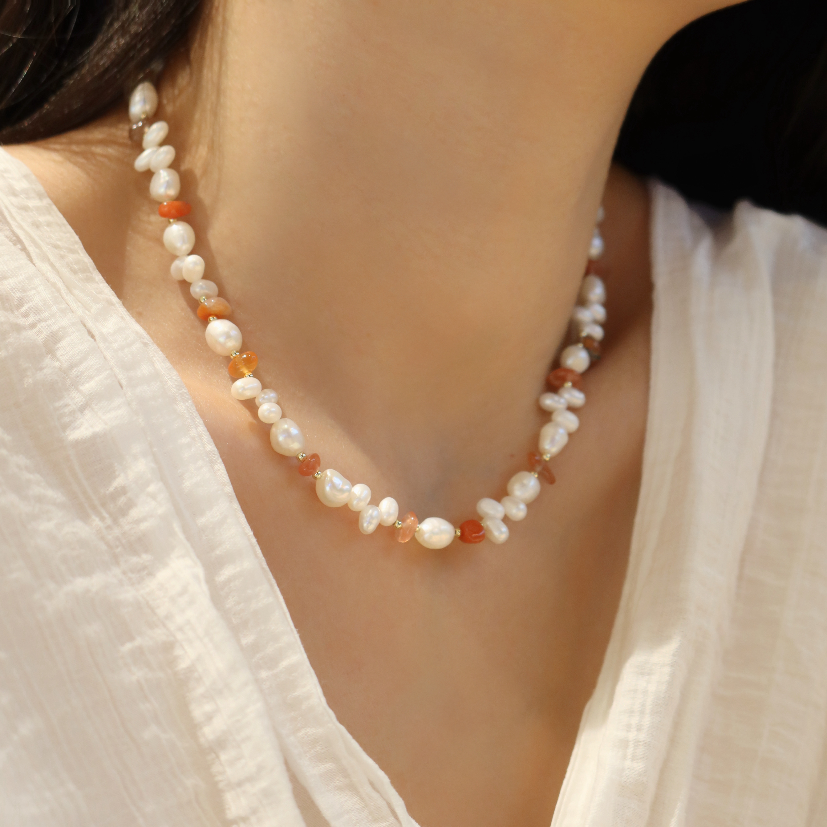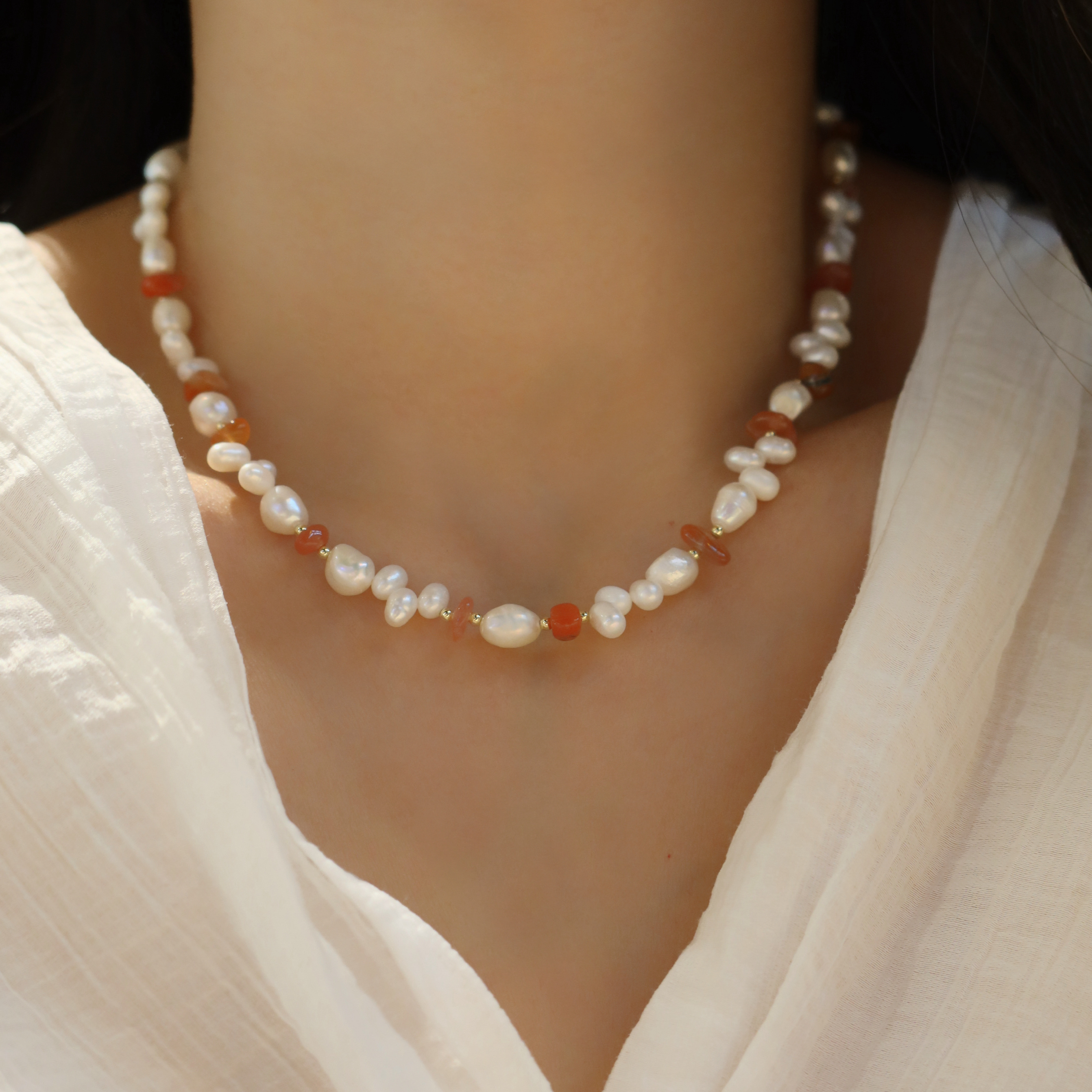 原创设计!随性大气天然珍珠项链女S925银南红玛瑙天然石锁骨链潮