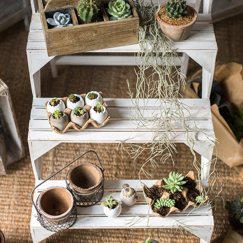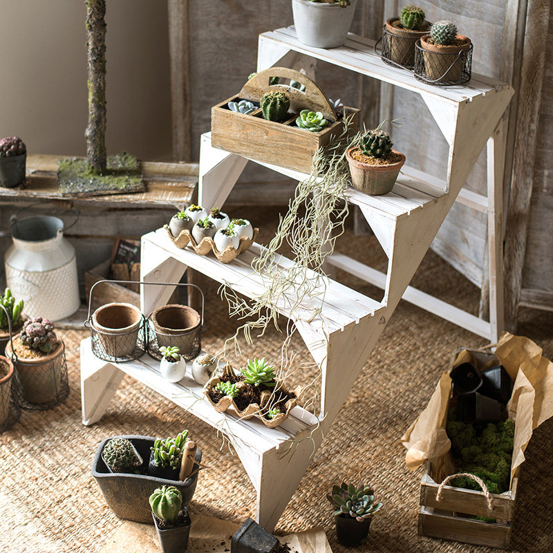 田园实木阶梯花架 多层楼梯台装饰陈列架 阳台花园客厅多功能摆件