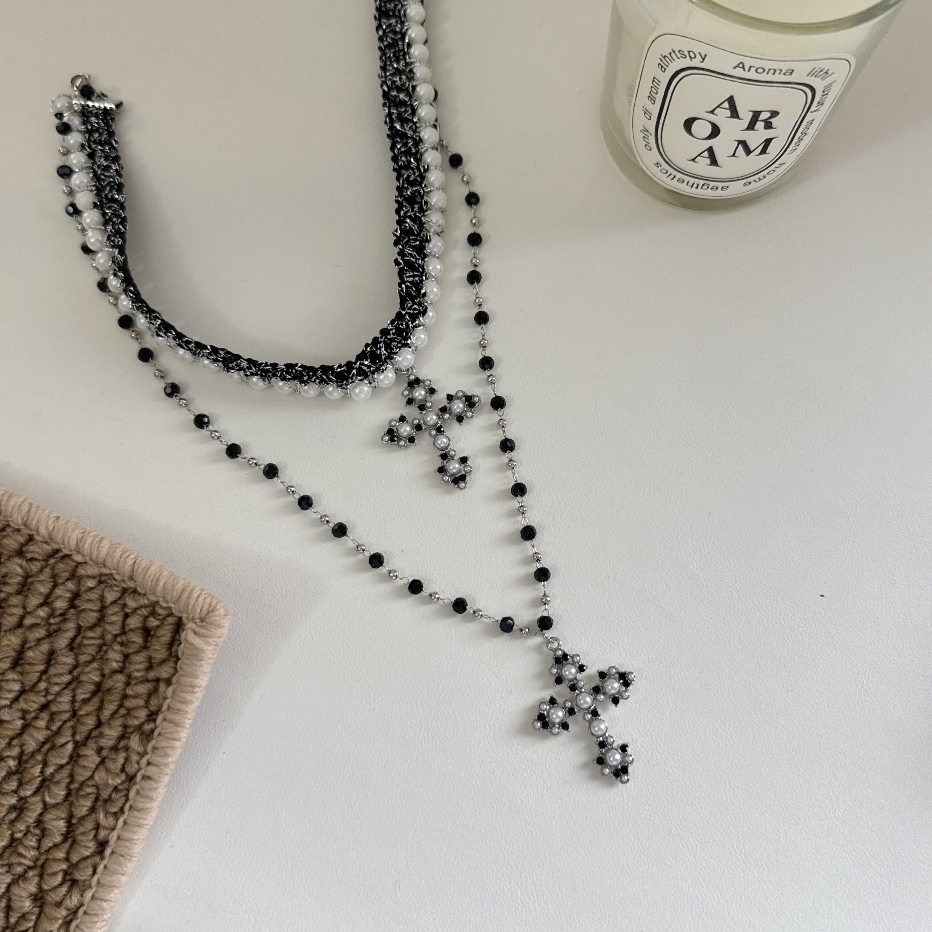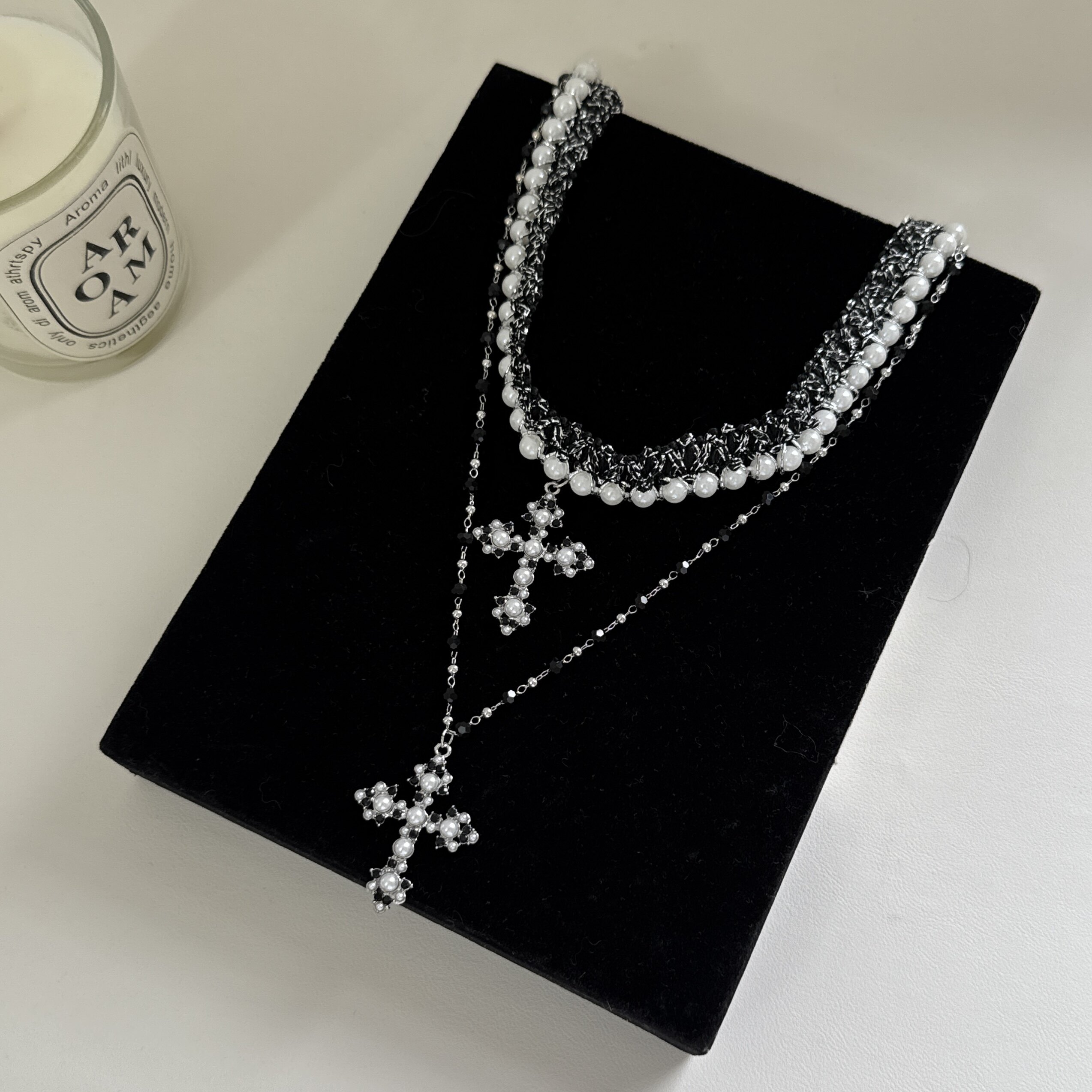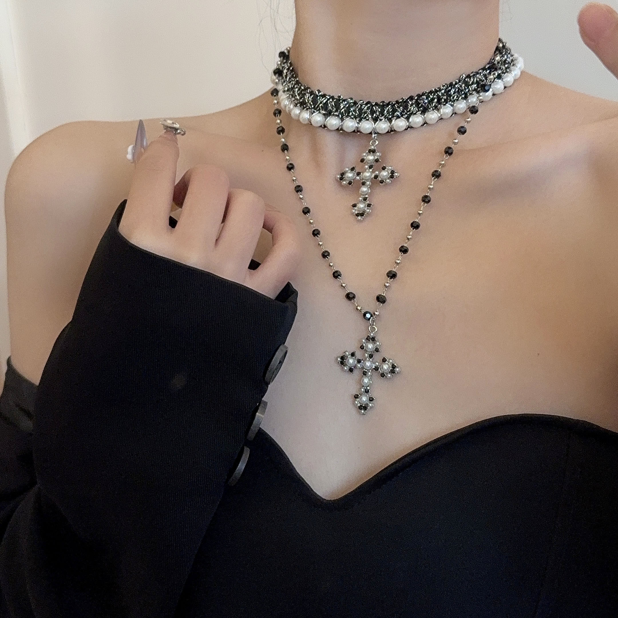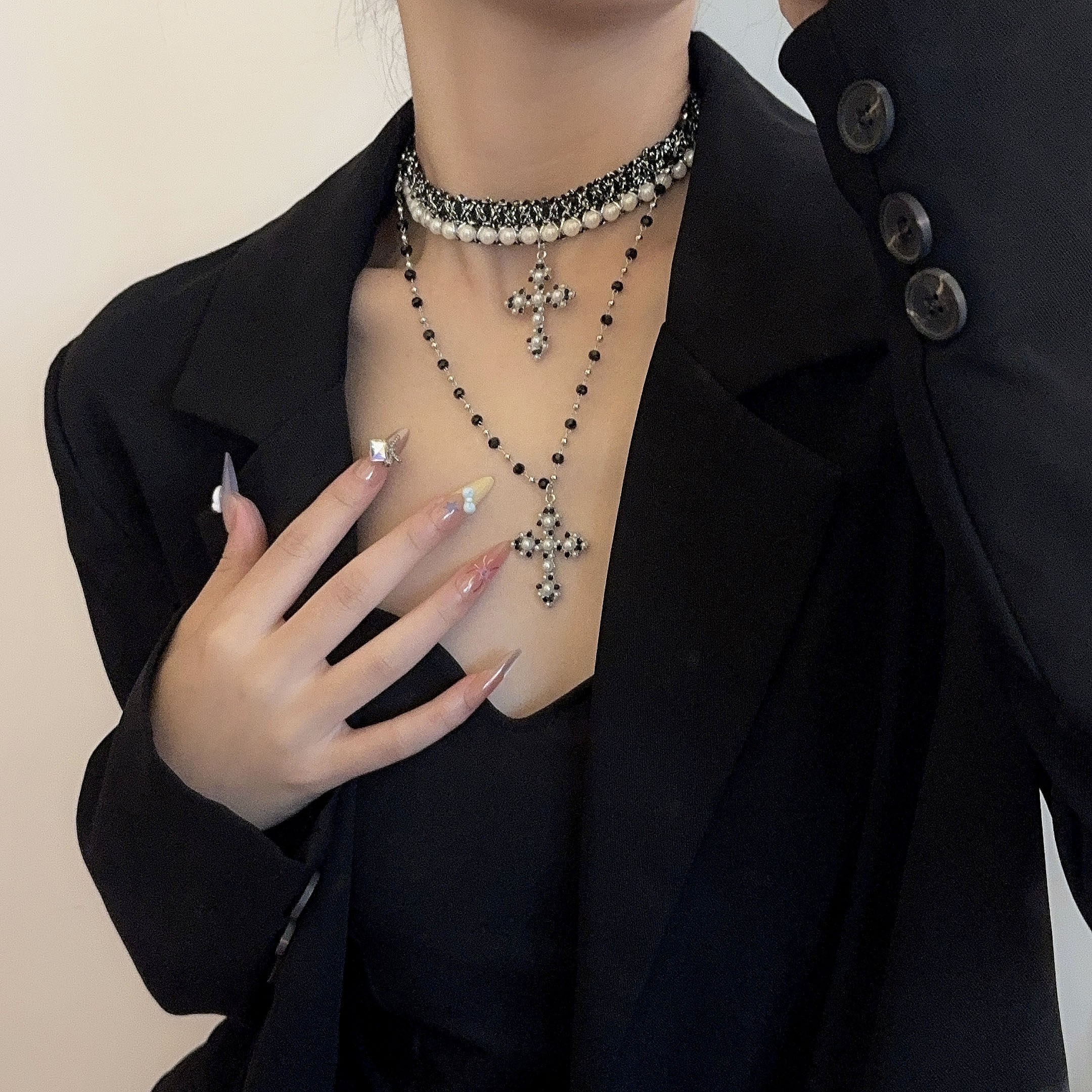 欧美暗黑亚文化多层镶钻珍珠十字架叠戴项链女小众哥特辣妹锁骨链